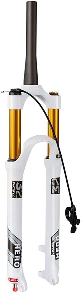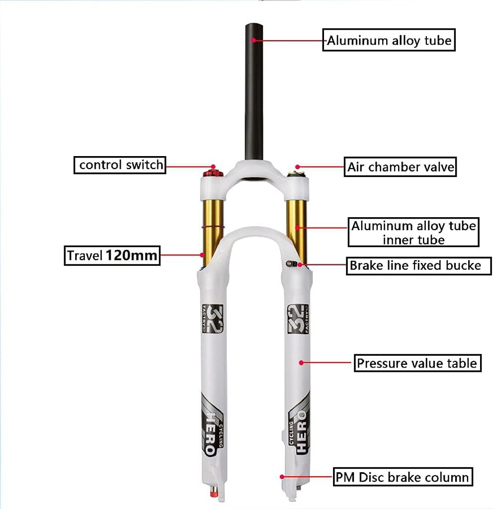 Mountain Bicycle Shock Absorber Front Forks Size: 26/27.5/29 inchSteerer Type : Straight /Tapered TubeTravel : 120 mmTravel inner diameter: 32mmAxle : 9mm QRLockout : Manual Lockout/Remote Lockoutbrakes : International A-pillar disc brakebrakes spacing : 75mmSteerer diameter: 28.6mm (1-1/8" Threadless) Top tube: Aluminum Alloy Fork outer tube : Magnesium alloyColor : whiteWeight about 1600~1800gPackage: 1PC MTB Air Suspension Fork (Boxed)Different screens may cause a little color difference between the color of the picture you see and the color of the actual product, please understand!We are very sorry for the inconvenience causedIf you have any questions, please contact us, due to the international time difference, we will answer your questions within 24 hours