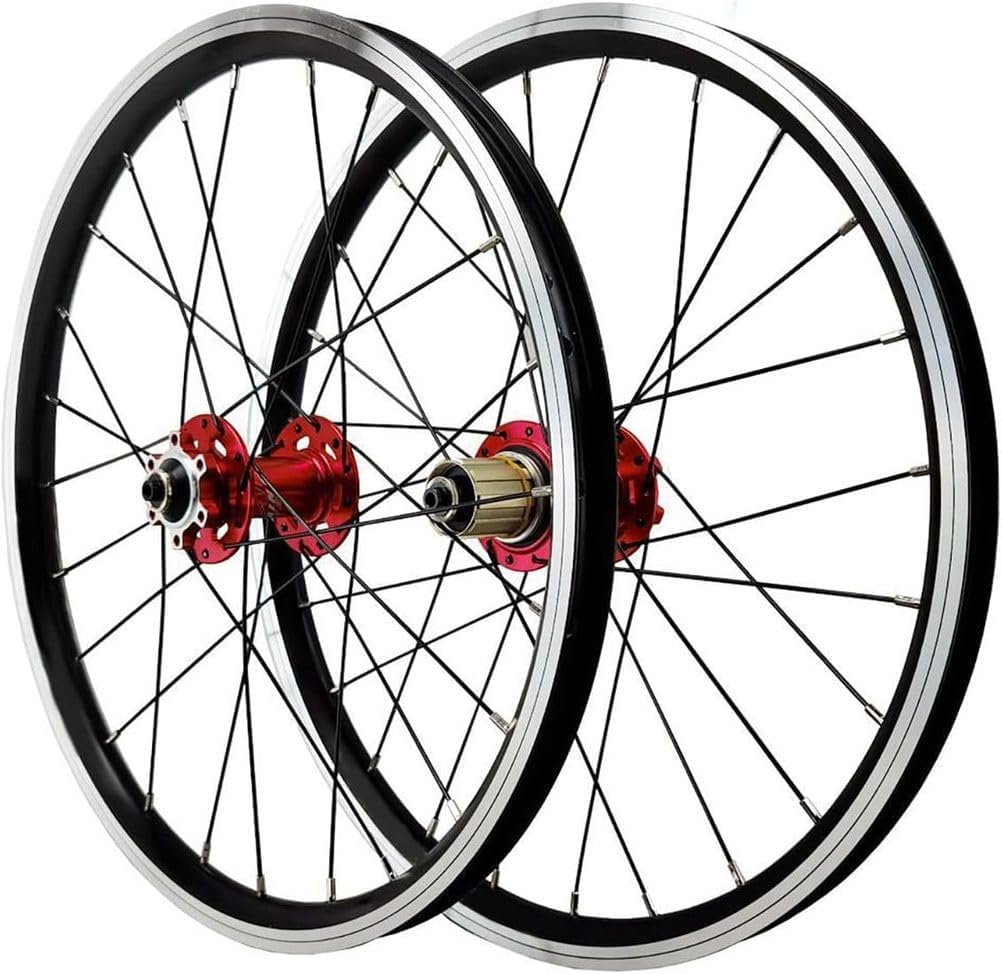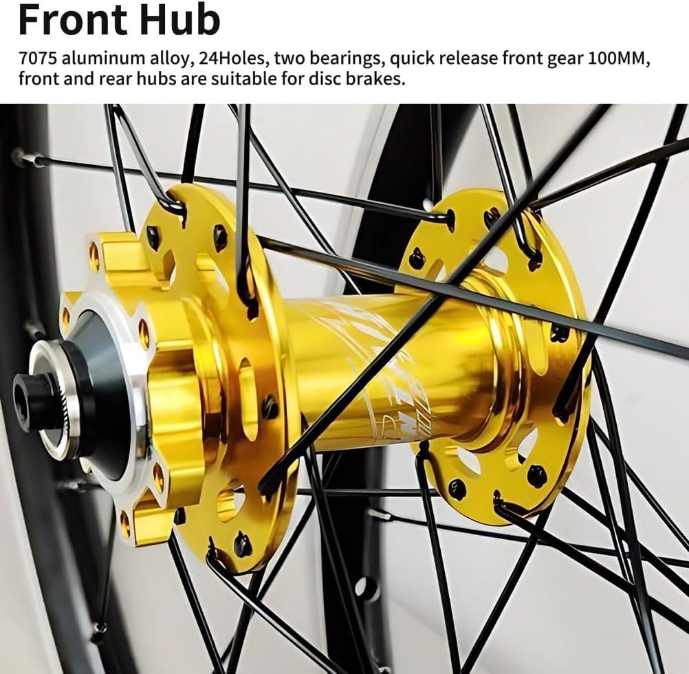 20 inch Bicycle Wheelset 406/451 BMX Bike Wheelset Disc Brake Quick Release Mountain Bike Front and Rear Wheels Aluminum Alloy Rims 24H Hubs for 7/8/9/10/11/12 Speed ​​CassetteBicycle Wheel Specifications:A couple of circles:Color: Black, Titanium, Blue, Red, GoldDimensions: 406/20 inches, 451 (20*1-1/8)Material: Double-layer aluminum alloy rimNozzle: Schrader A/V valveA pair of Hubs:Type: Disc brakeBearings: Front 2 Rear 4 bearingsNumber of holes: 24 holesQuick Release: Front Hub: 100mm, Rear Hub: 135mm (Rear hub design for tool-free removal (no tools required for future freehub maintenance/refueling)Rays:Front 24 Rear 24 spokes45# Stainless Steel Round Spokes14mm rustproof copper headFreehub Compatible:7-8-9-10-11-12 speed cassetteApplication: Folding Bikes/Mountain Bikes/BMXWeight Approx.:Front wheel weight 640g, rear wheel weight 740gPackage Included:Front wheel x 1Rear wheel x 1Quick Release Lever x (1 pair)PVC Tire Pads x 2