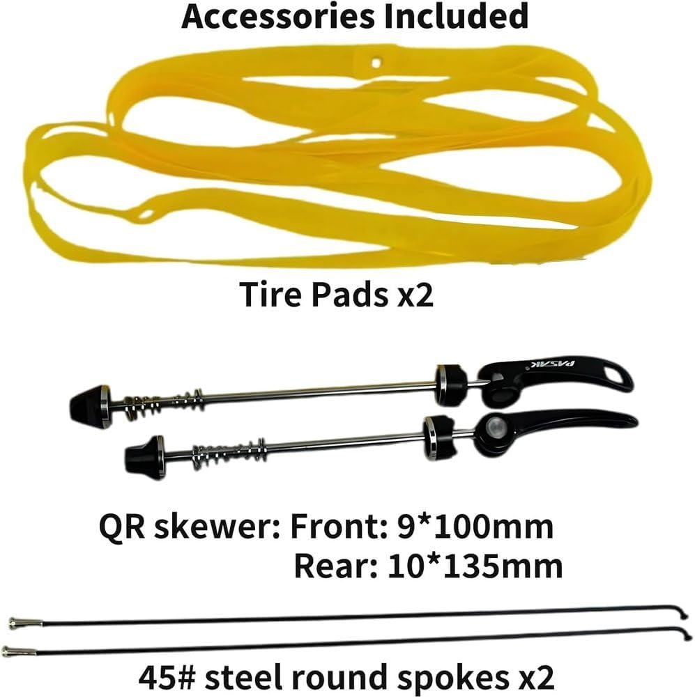 • Package: 1 front bike wheel, 1 rear bike wheel, 2 quick release levers, 2 tire pads. Before purchasing these rims, make sure the dimensions of this wheelset match the size you need.