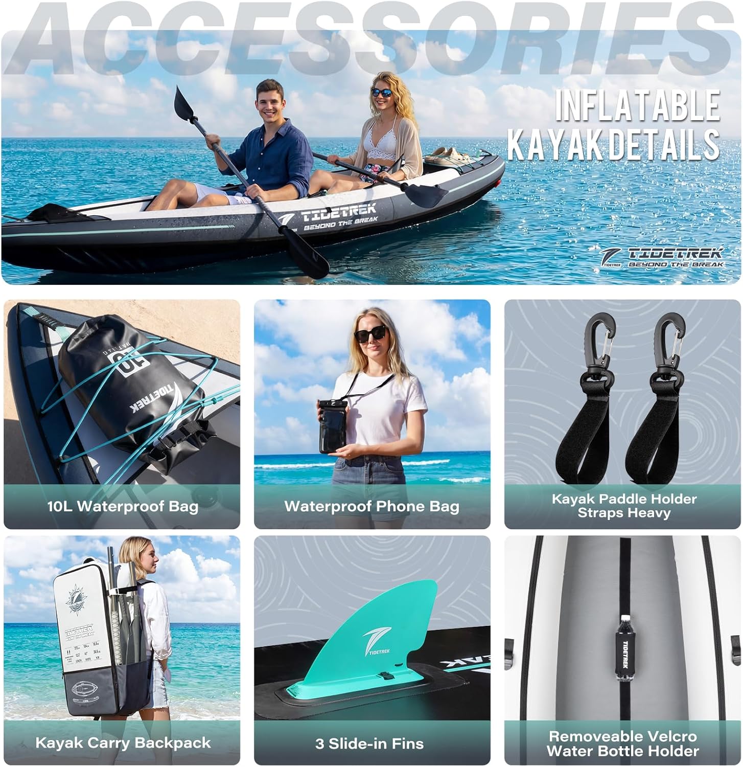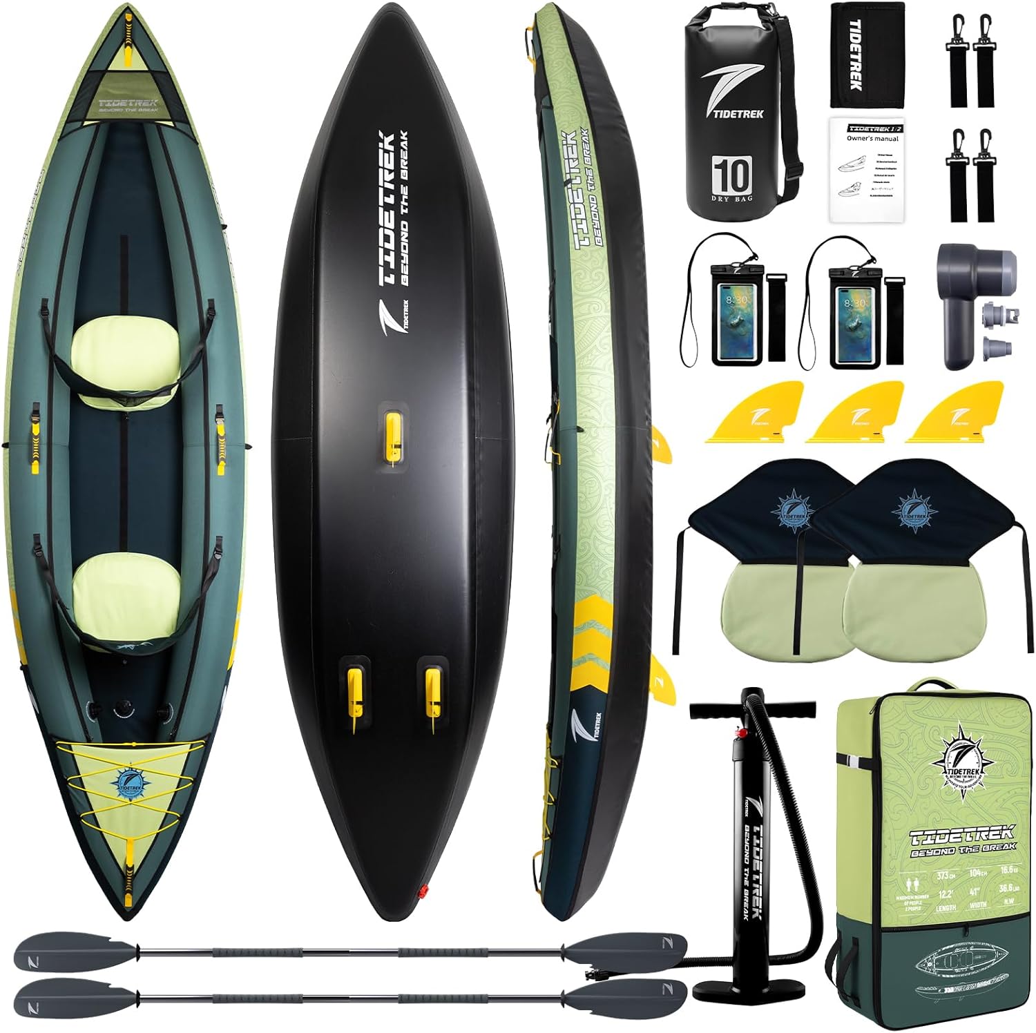 | Included Components | 1 Heavy-Duty Backpack, 1 Kayak Paddle (2 Kayak Paddles for 2-Person Version), 2 Hook-And-Loop Paddle Straps (4 for 2-Person Version), 3 Removable Fins, 1 Dual-Action High-Pressure Hand Pump, 1 Compact Low-Pressure Electric Pump, 1 Inflatable Kayak Seat with Waterproof Fabric (2 Seats for 2-Person Version), 1 10L Waterproof Dry Bag, 1 Waterproof Phone Bag (2 for 2-Person Version), 1 User Manual, Main Product:1 Inflatable Kayak |