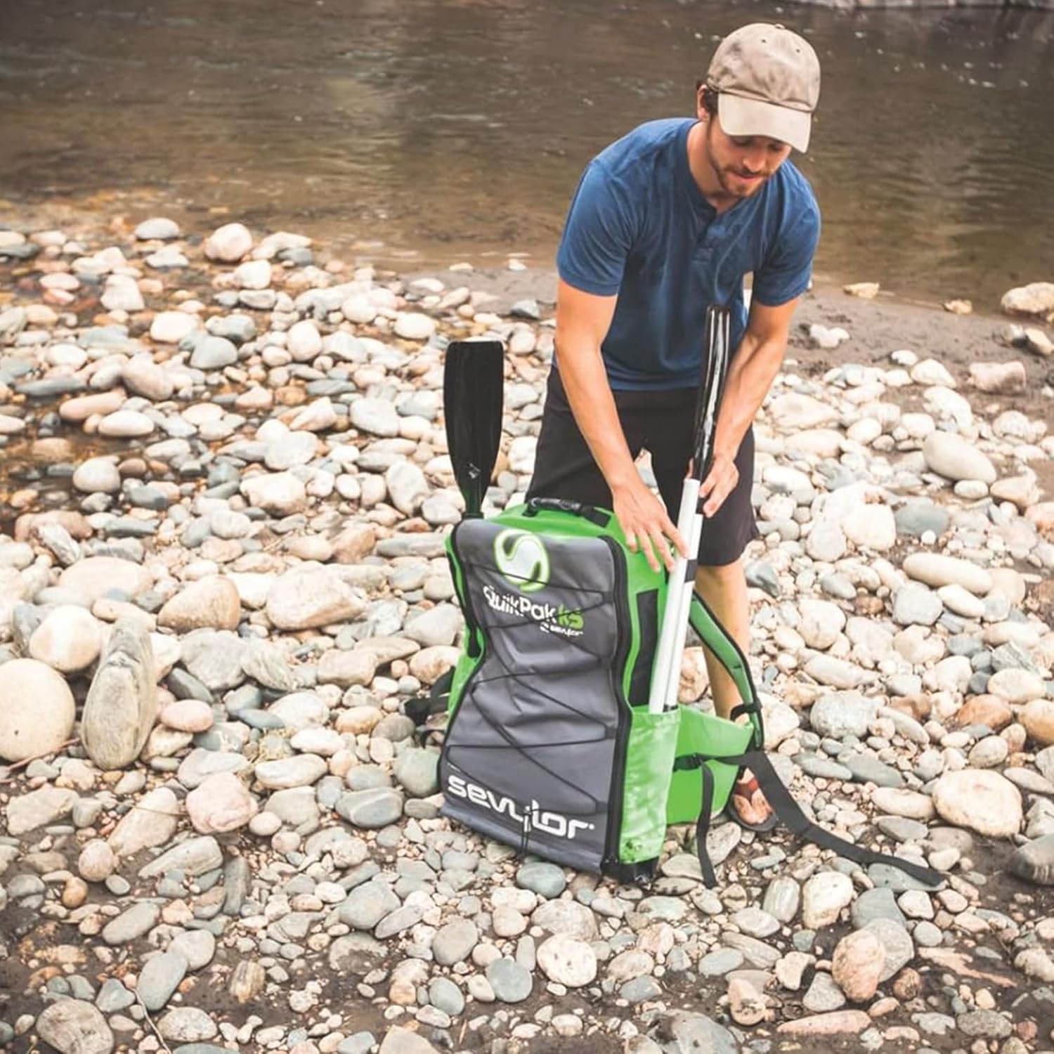 Hit the water in as little as five minutes with the Sevylor Quikpak K5 1-Person Kayak, where getting to your next trek is as easy as backpack - unpack - kayak. The innovative backpack system carries everything you need to get going and ultimately folds out into your kayak's seat. The 24-gauge PVC construction, rugged tarpaulin bottom and thick polyester cover easily handle the rigors of the lake. Just in case you do hit a snag, the multiple air chambers will help you get back to shore. Spray covers help keep you dry from splashed water. The D-Rings and bungee storage areas let you carry more gear on your trip that's easily accessible.