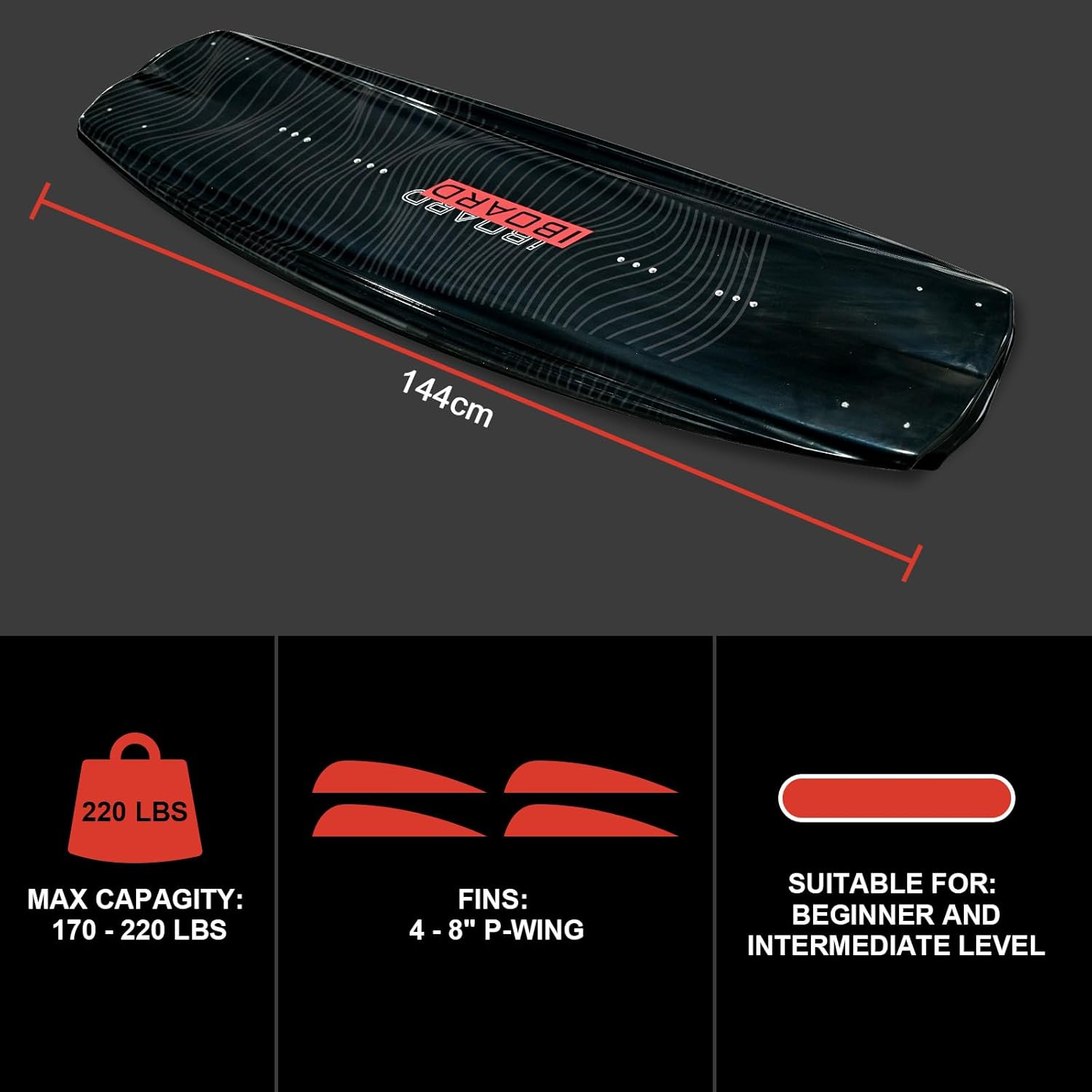iBOARD Wakeboard 144 cm Professional Wakeboards with Fins Perfect for Beginners to Advanced Riders - 3 Layer Glass Fiber Core Reinforced Sliding Speed&Stability