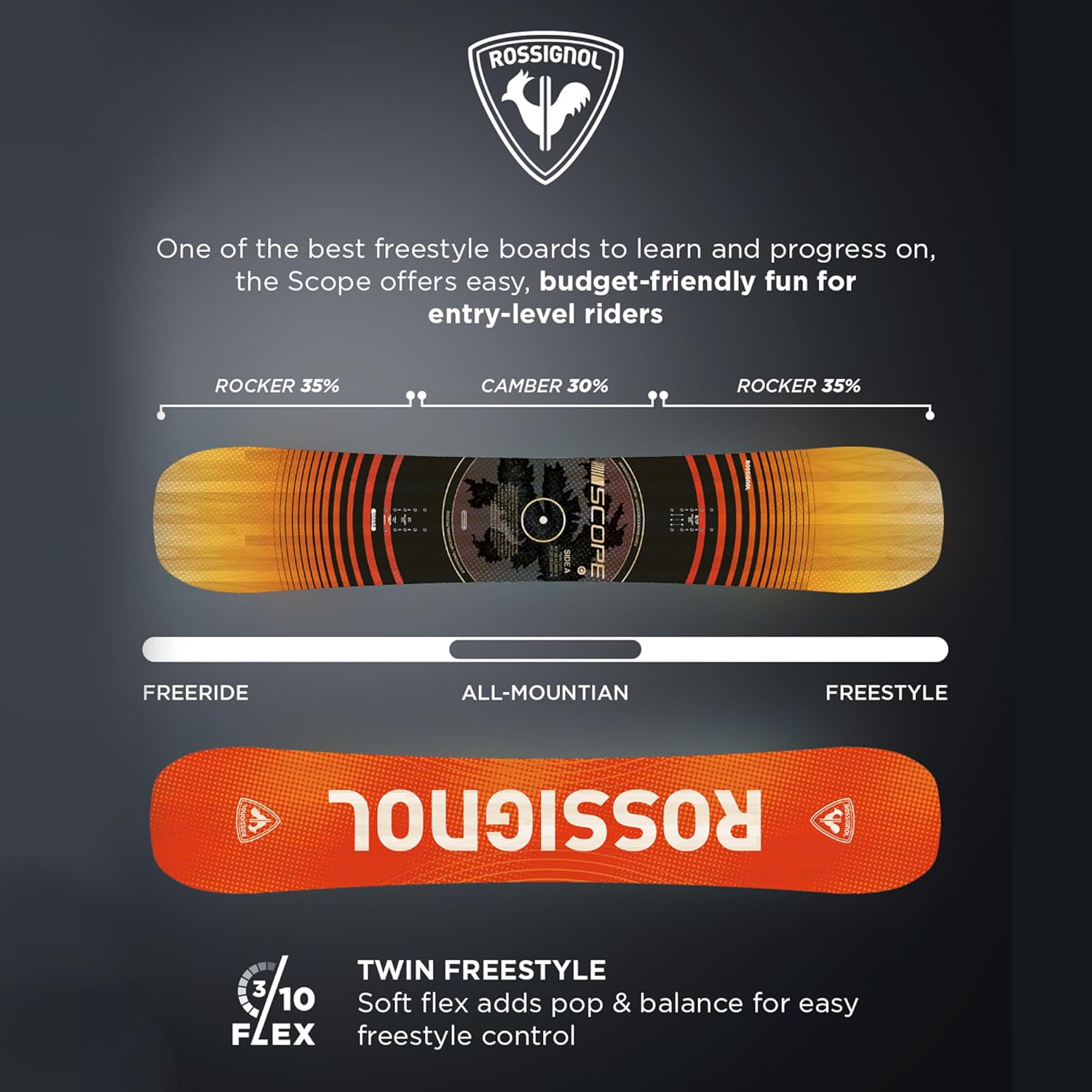 The Rossignol Scope snowboard for adults is built to make learning feel natural, approachable, and confidence-building from your first days on snow. As one of Rossignol’s most accessible freestyle beginner snowboards, the Scope offers a forgiving, easygoing ride that helps entry-level riders progress without feeling overpowered. Whether you’re cruising groomers, learning to ride switch, or exploring basic freestyle skills, this men’s and women’s snowboard keeps things smooth and manageable. Built to Perform, Made to Last At the core of the Scope is AmpTek Auto Turn rocker, a 70/30 rocker-to-camber blend designed for effortless turn initiation and catch-free riding. The softer flex from tip to tail gives this women's and men’s snowboard a playful, easy-to-control feel, helping reduce edge catches so riders can focus on balance and technique. The Twin Freestyle design features a symmetrical shape and flex, making this all-mountain snowboard feel consistent riding regular or switch. The Scope uses Rossignol’s vertically laminated wood core for reliable durability and consistent flex without unnecessary complexity. Fiberglass layers add elasticity and absorb chatter, while ABS sidewalls protect the core from moisture and everyday wear. With a Flex Rating of 3/10, the Scope is intentionally soft and forgiving. This makes turn initiation easier, improves control at lower speeds, and creates a more comfortable learning curve for riders building skills. About Rossignol For over 100 years, Rossignol has been crafting high-performance gear inspired by the Alpine Life philosophy. Precision-engineered and adventure-ready, our cold-weather gear empowers skiers and snowboarders to take on the mountains with confidence, warmth, and style.
