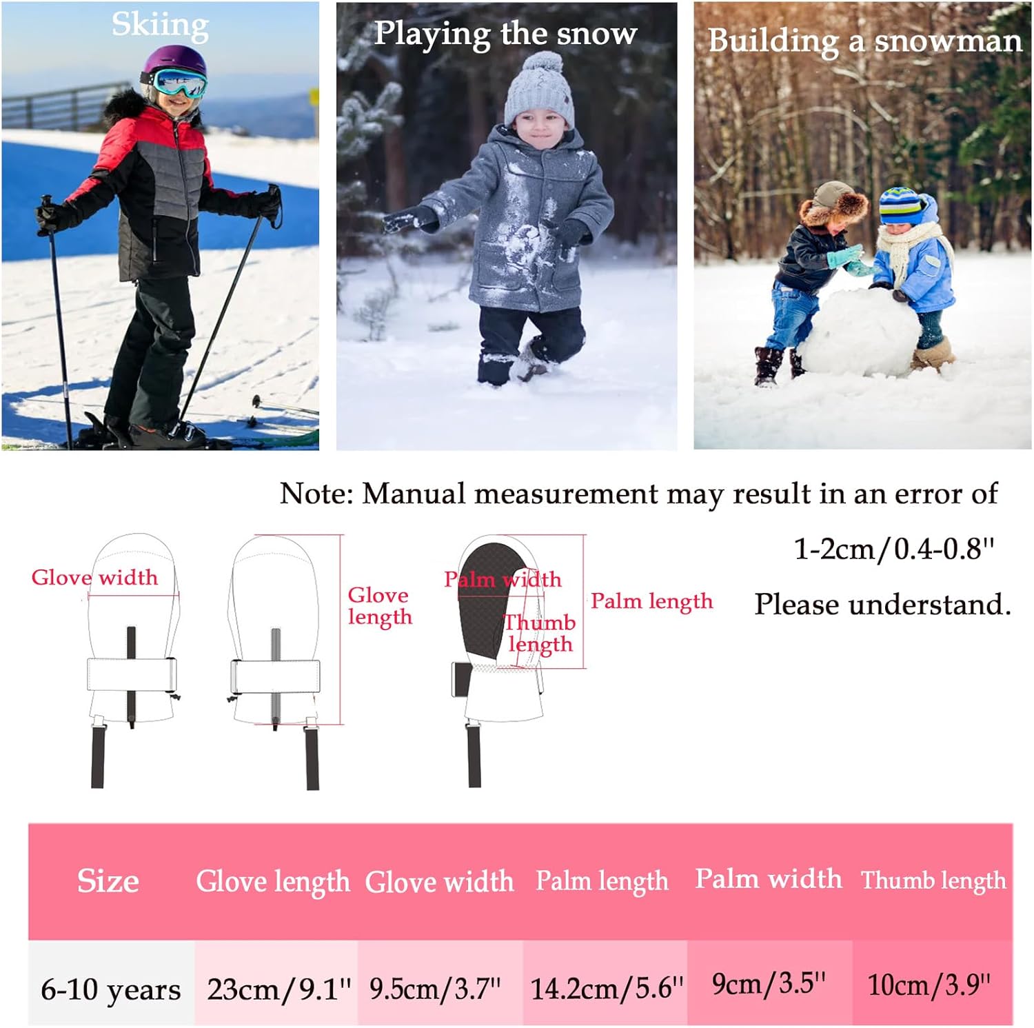 Product name: Kids winter mittensProduct features: Children's thickened, warm, and winter ski gloves for boys and girls (suitable for older children), with a mitten design.Product material: Composite no water ingress fabric, air cotton, PUColor: White, purple, blue, blackSuitable age: 6-10 yearsProduct size: Gloves: Length 23cm/9.1'', Width 9.5cm/3.7'', Palm length 14.2cm/5.6'', Palm width 9cm/3.5'', Thumb length 10cm/3.9'' (One size)Applicable Scenarios: Skiing, running, skating, mountaineering, alpine skiing, snowboarding, city cycling, winter hiking/camping, winter fishing; everyday warmth, holiday decorations/pet interaction. Ideal for outdoor family activities/winter sports. Suitable for extremely cold weather, snowy days for building snowmen and having snowball fights, or for school/commuting in rainy or snowy weather.Great gift: Children's Day gift, Christmas gift, birthday gift, gift for boys and girls.About color difference:Product pictures are all taken in real life, but due to the influence of light, display and other parameters, the real object may have slight color differences from the picture, please refer to the real object.Note:Due to different measuring tools and measurement methods, there may be errors in the size and weight, please refer to the real object.