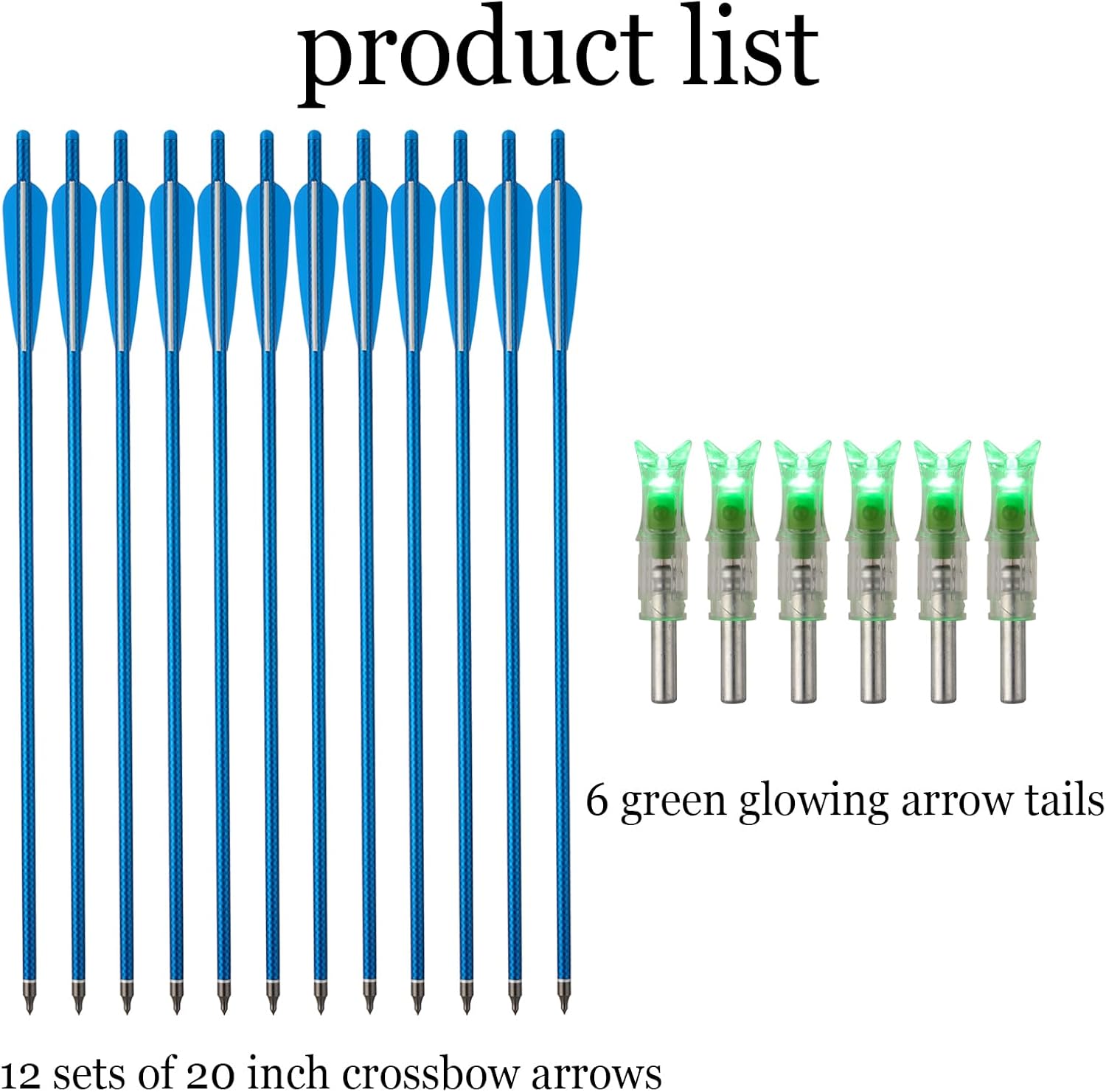 Crossbow Bolts With Lighted Nocks: The nocks are rotatable for directional adjustment and easily detachable. Be sure to check the nocks and fletching for proper placement for your bow. With replaceable nocks for free. Nocks are not fixed by glue. It can be adjustable for your bow. Equipped with 6 Green lighted nocks, offer enhanced visibility and tracking ability, making it easier to locate your shots.DURABLE AND SOILD - Made of precision machined from super hard solid stainless steel for lasting durability. EASY TO INSTALL - Standard screw-in insert thread design, easy to install for many kinds of arrows, suitable for carbon arrows, glass steel arrows, aluminum arrows and crossbow.GREAT PROFORMANCE - These arrow tips are sharp and . Remarkable precision and piercing power bring you a satisfactory experience when hunting and target practice.Shaft Material: CarbonCrossbow Bolts length: 20inchInner Diameter: 7.6mm/0.3"Outer Diameter: 8.8mm/0.346"Arrow Points Weight: 125 GrainPoint Material: Stainless steelColor:Blue/CamouflageUser Notice:1.Warning:check for damage before each shooting2.Do not shot against concrete wall or any hard substance. This may damage the arrows.3.The vanes may be bent because of long way transportation, The vanes may be bent because of long way transportation, it can soaked in hot water for a while.