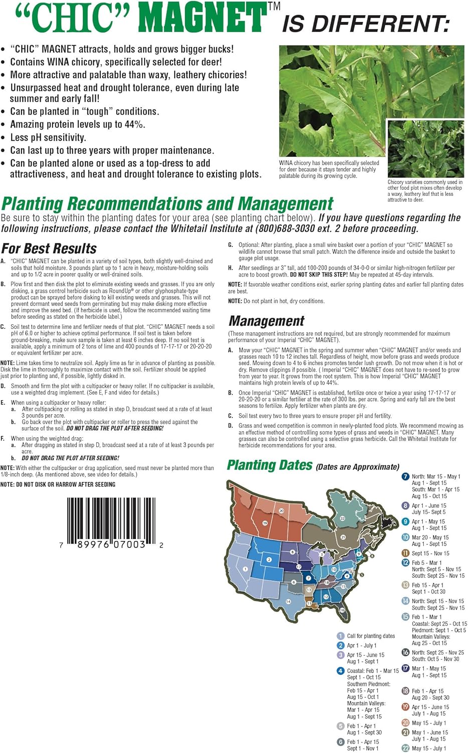 Whitetail Institute Imperial Chic Magnet - Premium Deer Food Plot Seed for Maximum Attraction & ProteinTransform your hunting property with a high-performance perennial forage that keeps deer coming back season after season. Engineered by Whitetail Institute, Chic Magnet combines superior palatability, drought resistance, and nutrient-rich forage to give you one of the most effective deer magnets on the market. Key Features & BenefitsHighly Attractive to Deer:This premium forage chicory seed is formulated with WINA-100, a tender, palatable chicory that whitetail deer prefer over traditional, waxy varieties - resulting in more frequent visits to your food plots.Boosts Protein for Antler Growth:Delivers up to 44% antler-building protein, giving deer the nutrients they need for healthy growth and conditioning. Extreme Climate Tolerance:Whether facing heat, drought, cold, or disease, Chic Magnet thrives where many other forages struggle - making it ideal for tough planting conditions. Long-Lasting Perennial:Plant once and enjoy up to 3 years of growth from a single seeding, saving time and effort compared to annual mixes. Enhanced Germination:Seeds are coated with RainBond™, boosting seedling survival and establishing robust plots that flourish even with limited rainfall. Versatile & Easy to UsePlant alone, mix with other seeds, or overseed into existing foragesWorks exceptionally well in moderately drained or moisture-holding soilsExcellent choice for both new plots and food-plot diversificationsUse CasesAttract more deer to your hunting propertyImprove forage quality and longevitySupport healthier deer herds with high-protein nutritionEnhance food plots that withstand tough weather