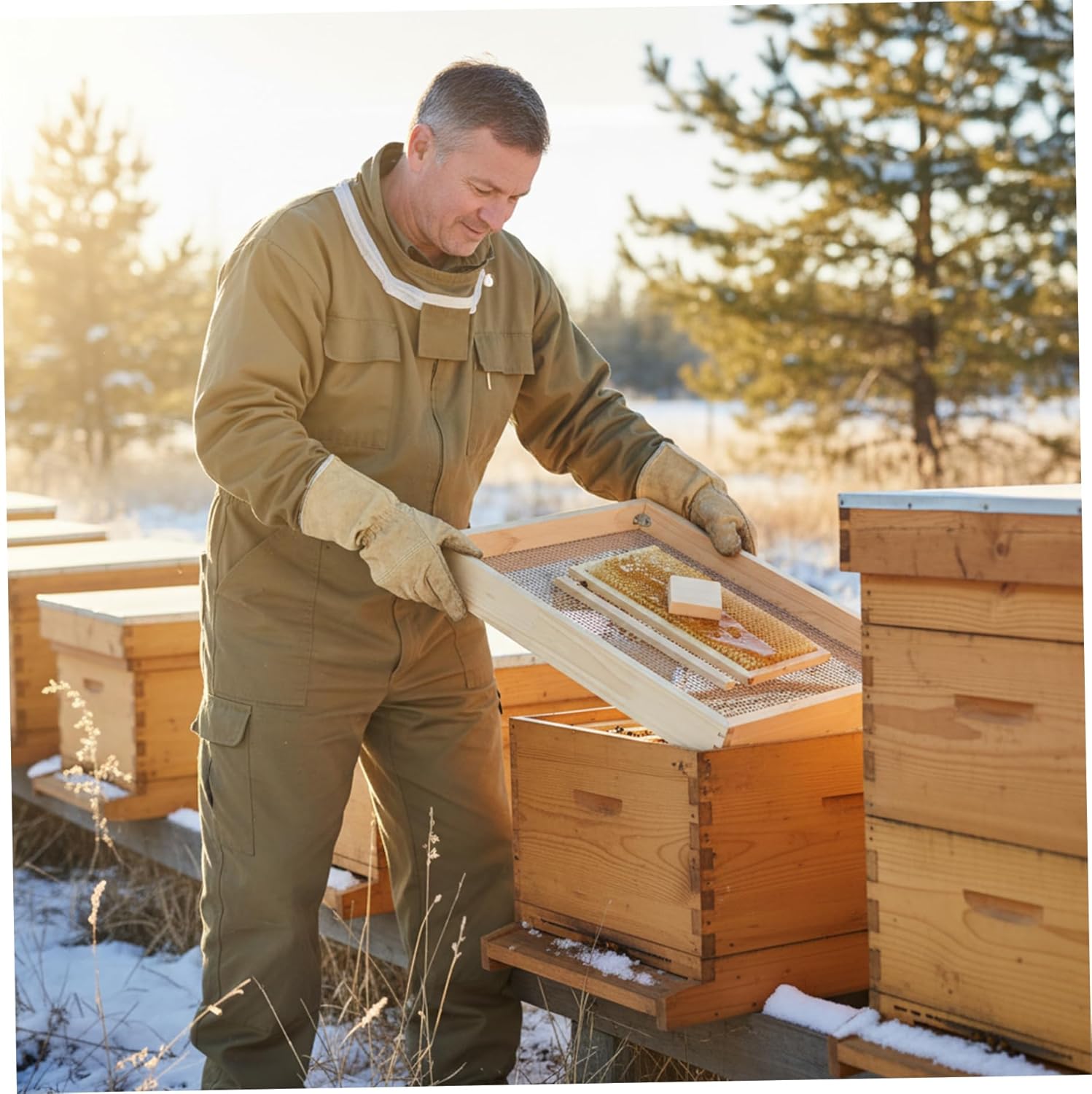 Description: Give your bees a helping hand during the challenging winter season with our sturdy Wooden Candy Board. This essential bee hive accessory is designed to provide a steady and accessible food supply when your colony needs it most.Crafted from wood, this candy board is built to last. Its key feature is the reinforced, welded galvanized wire mesh. This sturdy grid provides exceptional support for substantial sugar cakes, preventing sagging and ensuring the food remains in place throughout the season. To address a common frustration, we include a special wooden block. Placing this block on the mesh helps keep the holes open, preventing sugar from clogging the openings and allowing bees to feed freely.We prioritize safety and practicality. The wooden frame is designed with an extra interior wood layer. This smart design not only adds valuable space but also fully encases the wire mesh edges, eliminating the risk of points and making installation and removal safe and straightforward.Using this bee feeder is simple. Position it within your Langstroth bee hive as part of your winter preparation. It provides a crucial food , helping to maintain colony strength and warmth without frequent hive disturbances. A reliable tool for beekeepers aiming to support their bees' health through the winter. Features:. -Material: Wood. -Size: 50.5x35.5 cm/19.88x13.98 inch. Note:Manual measurement, please allow slight errors on size.The colors may exist slight difference due to different screens. Package Including 1 * Winter Bee Kind Candy Board