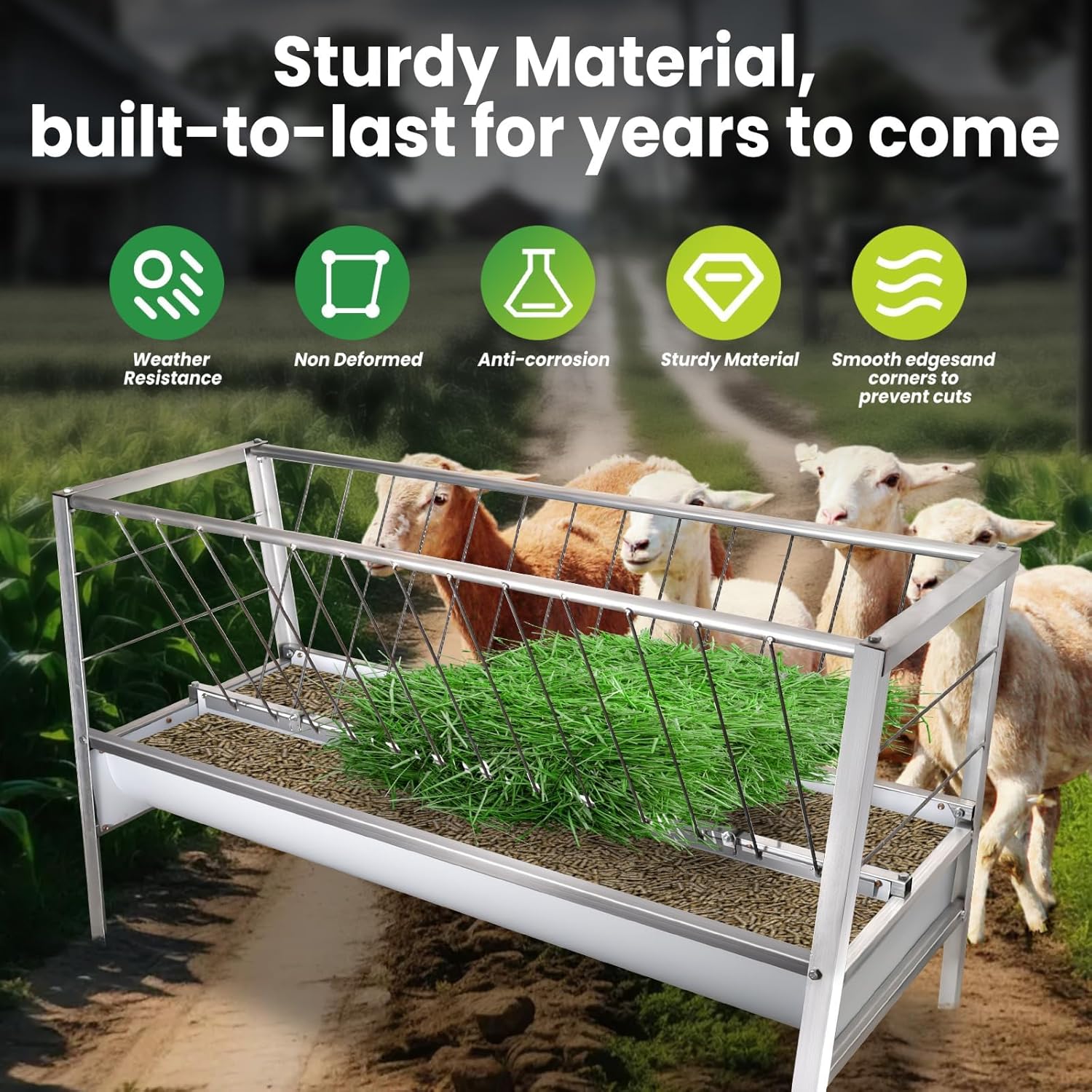 Function: The galvanized goat hay feeder is designed as a two in one structure, with dimensions of 59x19.6x33.4 inches, strong weather resistance, and suitable forindoor and outdoor use. The goat feeder can feed 20 sheep simultaneously, with a capacity of 60 gallons of hay and 30 gallons of chopped hay. Easy toassemble, equipped with detachable trays. Design: Two in one designLength: 59 inches Width: 19.6 inches Height: 33.4 inches Material: Galvanized stainless steel. Durability: Corrosion resistant, not easy to paint, Slot design: Smooth circular slot Usage environment: Hot dipped stainless steel is used indoors, and it is suitable for various weather conditions outdoors. Feeding capacity: 20 sheep can be fed at once. Color: Silver. Applicable places: Suitable for sheep houses, cattle houses, stables, pigsties, etc. Capacity: 60 gallons of hay and 30 gallons of chopped hay and grains per load. Assembly: Easy to assemble, equipped with detachable grain trays. Installation steps: Fixed feed rack bracket. Install the fee