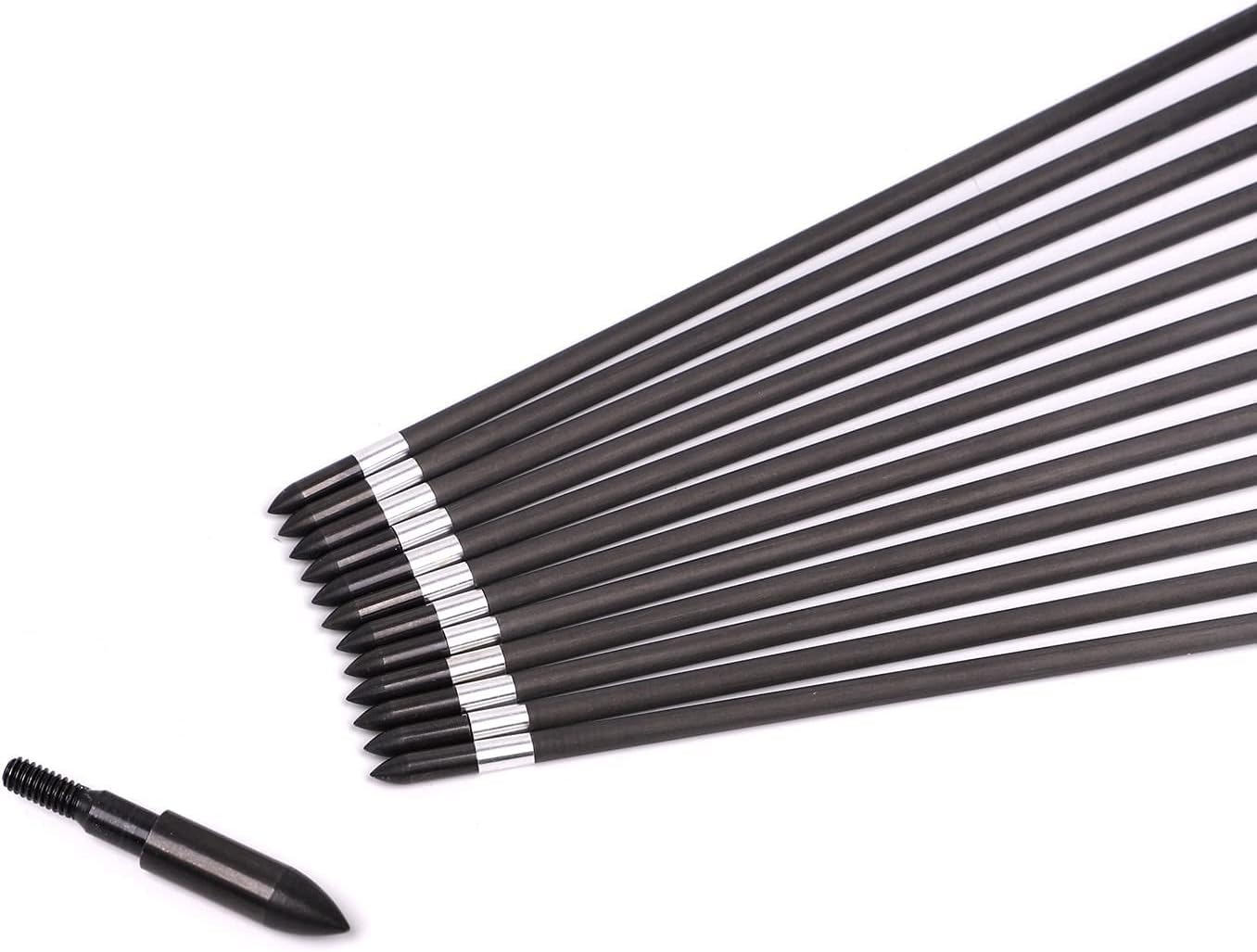 Inner Diameter 5.2mm (.204") Pure Carbon Arrow for Indoor Outdoor Target Practice and Hunting Technical Specification Material: 100% pure carbon fiber tube Straightness: +/-0.003" Spine: 300 350 400 500 600 700 Max Shaft Length: 31inches Outer Diameter: Spine 300 OD=6.96mm GPI=9.74grain/inch Spine 350 OD=6.71mm GPI=8.68grain/inch Spine 400 OD=6.63mm GPI=7.94grain/inch Spine 500 OD=6.5mm GPI=7.16grain/inch Spine 600 OD=6.33mm GPI=6.19grain/inch Spine 700 OD=6.31mm GPI=5.55grain/inch Arrowhead: replaceable bullet point Fletching: 2" streamline plastic vanes, 2 red 1 black Nock: plastic nocks with aluminum pin Color: black shaft with red vanes Package: 12pcs carbon arrows"PPP" Features Precision: the strict production process makes these arrows up to the standard of competition arrows, making your archery more accurate and easy. Protective: the reasonable arrow weight can also reduce the energy transfer to the bow while ensuring the maximum initial speed. Purposeful: the combination of accessories makes them perfect for indoor outdoor training and shooting.Personal Customization If you didn't find the option you want, please choose CUSTOM SPINE & SIZE. Leave us message with the length and spine of arrow you need, we will customize the arrow for you.Note All items are NOT toys, please keep away from kids.