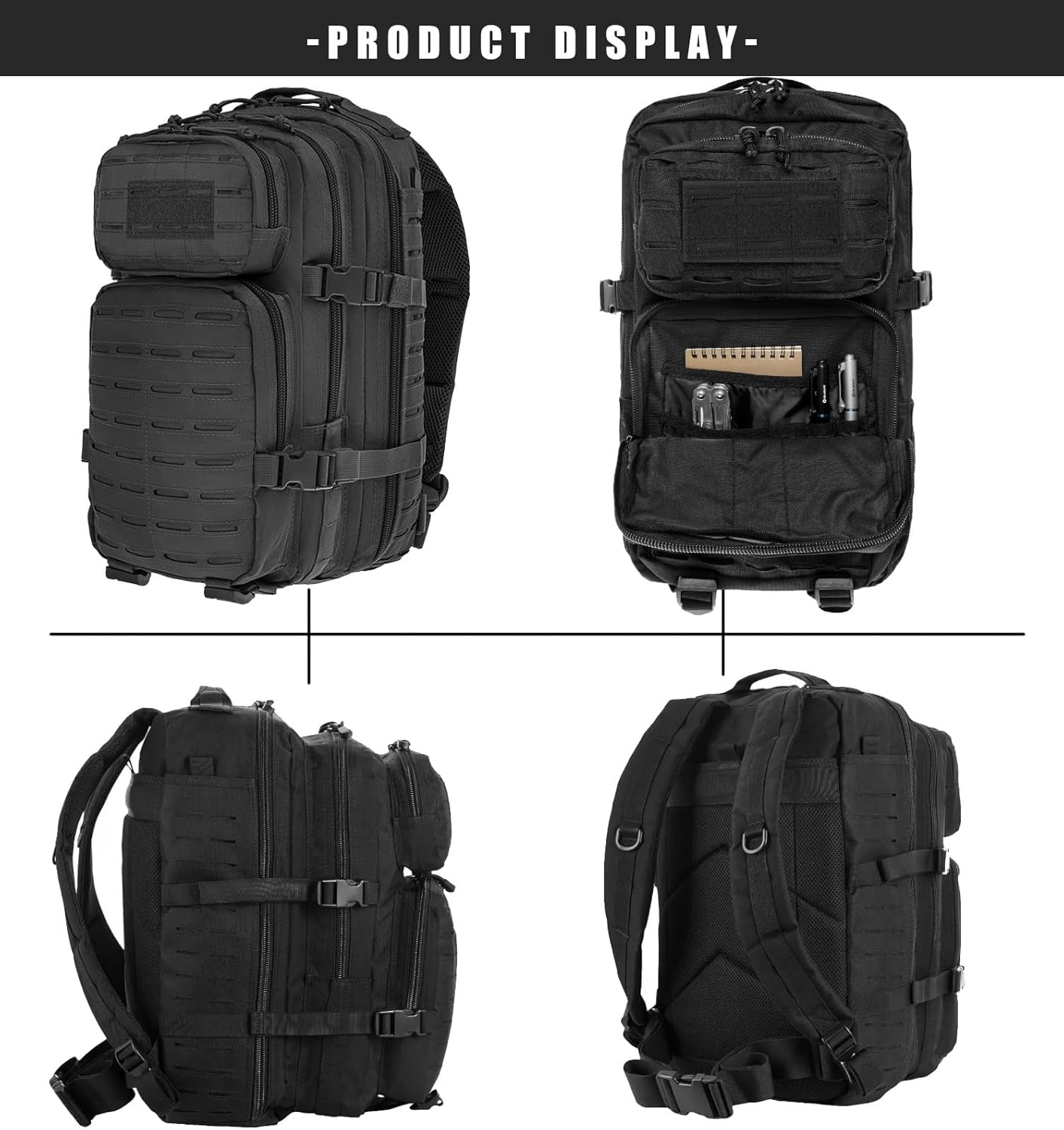 Durable Construction: Made from high-quality, water-resistant, and tear-resistant materials, ensuring longevity and protection from the elements.MOLLE System Compatibility: The exterior is equipped with MOLLE webbing, which allows for additional pouches, accessories, and tools to be attached, increasing customization and carrying capacity.Multiple Compartments:Main Compartment: Spacious and perfect for holding gear, survival tools, or clothing.Front Pockets: Smaller zippered compartments for quick access to essentials like pens, notebooks, or multi-tools.Secondary Pockets: Adjustable side pockets and additional storage spaces to organize your items efficiently.Molle webbing for adding tactical pouches.water-resistant and durable 900D Oxford fabric.Large 35L capacity for essential gear.Multiple compartments for organization.Hydration compartment for water bladder (not included).Breathable mesh padded back and straps.Adjustable chest and waist straps for comfort.Heavy-duty zippers and cord pulls for durability.Ideal for outdoor, tactical, military,army,hunting survival,hiking,camping and daily use.Lifetime Warranty