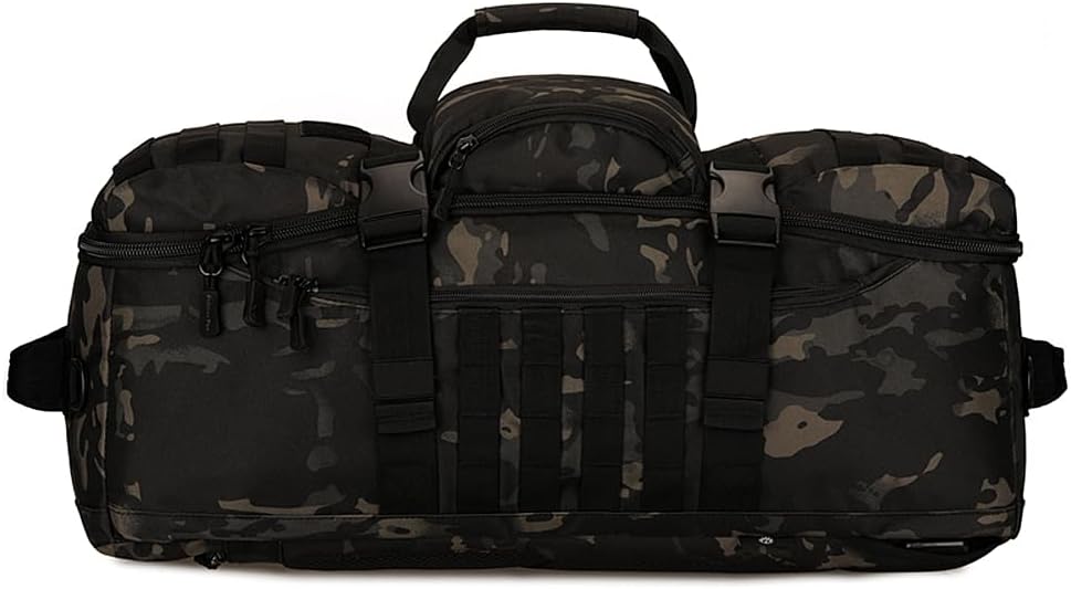 UNISTRENGH 60L Backpacking Tactical MOLLE Multifunctional Travel Bag with Padded Military Backpack Shoulder Straps Duffle BagSpecification:Capacity: 60 LMaterial: High-intensity military-style specifications 900D Nylon, scratch-resistant, Not easy to fade.Dimensions: 13.8'' L x 9.8" W x 25.6" HWeight: 4.4 LBStructure:1.Exterior: Three zipped pockets,Three Card Buckle Closure Package Cover,Two hand strap2.Interior:Two zipper layers,Three main areas divided by velcro dividers.3.Inner Material: Waterproof Silky Cotton4.Back: Thicken Breathablec SpongeFeature:1. Main compartment may be used in its entirety or be divided into 3 areas with two zippered divide.2. Zippered internal dividers made to compartmentalize the master compartment.3. Multipurpose: it can be used as a handbag, backpack or as a shoulder bag, camera bag.4. Adjustable long shoulder strap can quickly adjust to their comfortable state,so that more comfortable Backpack.5. Detachable waist belt.6. External system designed to be used in combination with other equipment,you can load pockets,water bottle bag,accessory kits and other.7. The bag works well with a variety of different outfits and casual styles.8. Ideal Use: Military, Tactical Assault Gear, Hiking, Hunting, Camping, Sports & Gym.