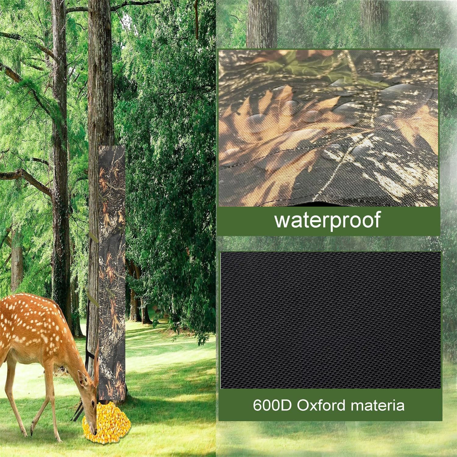100lb Large Capacity Waterproof Camouflage Deer Feeder Bag, Gravity Feeder Bag Drop For Easy Deer Attraction! Camouflage Hunting Accessories, A Must Have For Field Hunting!1.This deer feeding bag has an amazing 100lb capacity, whether it's corn, grain or mixed feed. It can meet the needs of deer attraction for many days without frequent replenishment, so you can focus on hunting and no longer worry about the shortage of feed. 2.Adjustable tree-hugging design, suitable for different thicknesses of tree trunks. Waterproof Oxford material ensures dry and fresh feed even in inclement weather such as heavy rain, wind and snow, maintaining the best luring effect at all times. 3. Camouflage pattern perfectly blends into the natural environment, cleverly hides the feeder trail and reduces the alertness of the deer herd. Gravitational automatic feeding system, just pour the feed from the top, it can automatically put the corn on the ground accurately, without complicated operation, easily attract the deer to come to feed, it is your right-hand man for hunting in the field.
