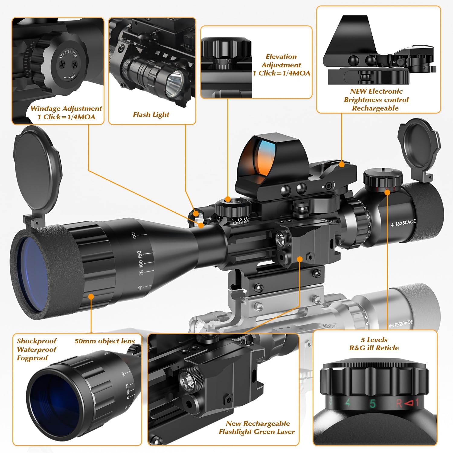 The combo multifunctional scope is suited for wide range sports , it is with full multi-coated high light transparency and high optical clarity Lens at 4-16 times magnification. The scope Multi Optical Coated reticles can be illuminated in red or green light , it can get a well suitable sight regardless of light or Surrounding environment.The Laser Class: IIIa , Maximum Output Power: ≤ 5 mw , it get the distance of 200-400meters ,also with the clear Holographic Reticle Red Dot . The 5 modes flashlight bring you a more bright sports environment if needed.