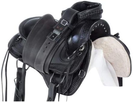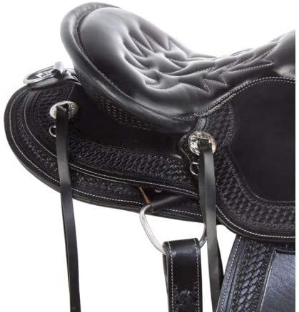 Saddles are an essential piece of equipment for any equestrian enthusiast. Whether you're a casual trail rider or a competitive show jumper, a well-fitted saddle can make all the difference in your comfort and performance. These sturdy leather seats are designed to distribute your weight evenly across the horse's back, ensuring a smooth and balanced ride. With a variety of styles, from Western to English, and sizes to accommodate both riders and mounts, you can find the perfect saddle to suit your needs. Invest in quality craftsmanship and materials for a saddle that will last through countless adventures and provide the support you need to enjoy every moment in the saddle. This amazing pleasure trail saddle is now available in black! This amazing comfortable saddle features an intricate hand carved tooling within the leather that gives this saddle a flashy, yet classic cowboy design. The black suede seat is well-padded for comfort and features a decorative quilt stitching that adds additional grip within the seat while riding. Numerous ties are added to the saddle on shiny silver conchos for accessory attachments such as saddle bags. The underside is well-padded with fleece to ensure your horse stays comfortable throughout the ride. Receive a matching headstall, reins, and breast collar while supplies last. Cinches not included. Saddle Specifications: 100% Premium Cowhide Leather Hand Carved Leaf & Basket Tooling Well Padded Suede Seat Quilt Stitched Seat Design Padded Adjustable Stirrups Numerous Ties For Accessories Shiny Silver Etched Conchos Well-Padded Fleece Underside Well Balanced Wood & Fiberglass Tree Saddle Measurements: Seat: 14” to 18" Inches Seat. Gullet: 7” FQHB Skirt: 26 – 29” Horn: 3.25” Swell: 12” Cantle: 4” Stirrups: 26 – 36” Weight: Approx. 26 lbs.lbs