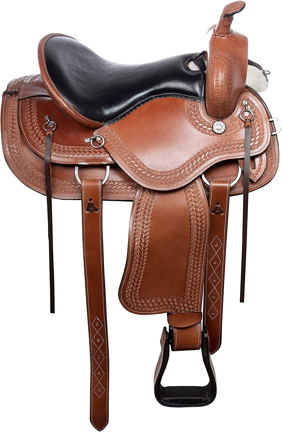 Saddles are an essential piece of equipment for any equestrian enthusiast. Whether you're a casual trail rider or a competitive show jumper, a well-fitted saddle can make all the difference in your comfort and performance. These sturdy leather seats are designed to distribute your weight evenly across the horse's back, ensuring a smooth and balanced ride. With a variety of styles, from Western to English, and sizes to accommodate both riders and mounts, you can find the perfect saddle to suit your needs. Invest in quality craftsmanship and materials for a saddle that will last through countless adventures and provide the support you need to enjoy every moment in the saddle. This amazing pleasure trail saddle is now available in black! This amazing comfortable saddle features an intricate hand carved tooling within the leather that gives this saddle a flashy, yet classic cowboy design. The black suede seat is well-padded for comfort and features a decorative quilt stitching that adds additional grip within the seat while riding. Numerous ties are added to the saddle on shiny silver conchos for accessory attachments such as saddle bags. The underside is well-padded with fleece to ensure your horse stays comfortable throughout the ride. Receive a matching headstall, reins, and breast collar while supplies last. Cinches not included. Saddle Specifications: 100% Premium Cowhide Leather Hand Carved Leaf & Basket Tooling Well Padded Suede Seat Quilt Stitched Seat Design Padded Adjustable Stirrups Numerous Ties For Accessories Shiny Silver Etched Conchos Well-Padded Fleece Underside Well Balanced Wood & Fiberglass Tree Saddle Measurements: Seat: 14” to 18" Inches Seat. Gullet: 7” FQHB Skirt: 26 – 29” Horn: 3.25” Swell: 12” Cantle: 4” Stirrups: 26 – 36” Weight: Approx. 26 lbs.lbs