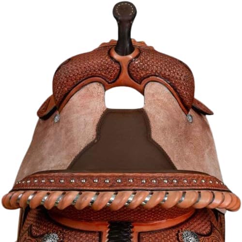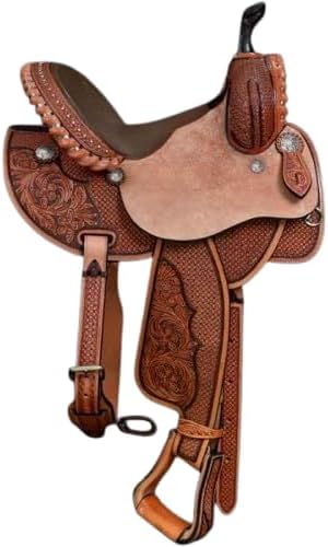 Western Barrel Racing Wooden Tree Horse Saddles Handmade Premium Leather Comfort for Horses Trail Equestrian Tooled Carved Horse Saddle for Riding Size: 10"-18" inches Seat Available Experience the timeless appeal of a classic saddle. Crafted with meticulous attention to detail, this saddle is designed to provide both rider and horse with optimal comfort and support. The high-quality leather construction ensures durability and longevity, while the ergonomic design promotes proper positioning and balance. Whether you're hitting the trails or competing in the show ring, this saddle will become your trusted companion, allowing you to ride with confidence and style. With its sleek lines and traditional aesthetic, it's a sophisticated choice for equestrians of all levels. *** Girth Cinch, Back Cinch, Saddle Pad, and Horse Bit NOT INCLUDED *** Saddles are an essential piece of equipment for any equestrian, providing the crucial connection between rider and horse. Crafted with care and precision, a high-quality saddle offers comfort, support, and control for both the rider and the animal. Whether you're a seasoned competitor or a casual trail rider, finding the right saddle can make all the difference in your riding experience. With a wide range of styles and materials available, from classic English to rugged Western designs, there's a saddle to suit every discipline and preference. Invest in a well-made saddle, and you'll enjoy countless hours of enjoyable and secure riding adventures. Premium Quality leather Soft Fleece Underside, Fully Hand Carved. Beautiful Floral Weave Leather Design on Pommel, Cantle, Skirt, Fender, Stirrups, "TOOLING - FULLY HAND TOOLED FLORAL DESIGN ", Soft fleece underside. Our horse tacks are built on strong wooden trees which will have less pressure on your horse's back and provide rider comfortable seating. 100% authentic handmade saddle. Expertise in all equestrian products, each product in our store goes through stringent quality check and are handmade. This premium all-around barrel saddle is perfect for any discipline whether you are turning and burning at the rodeo, or out for a leisurely trail ride! This saddle features a comfortable, thickly-padded Leather seat that will grip you into the seat when going around the barrels. The saddle also features numerous ties for accessory attachments, such as saddlebags, for when you are out on the trail or around the ranch. The saddle has a classic studded trim around the edges for added appeal, along with shiny silver sun conchs that make this saddle stand out from the rest. The well-padded fleece underside ensures your horse stays comfortable while helping to eliminate pressure points. Saddle Measurements & Specifications - Color;- As Per Picture Gullet-: 10": 5.5"; 12 to 13": 6.5" 14 to 18" 7" FQHB. Skirt-: 26.5”, Horn-: 3”, Swell-: 12.5”, Cantle-: 4.5”, Stirrups-:28 - 38”, Weight-: 26 LBS