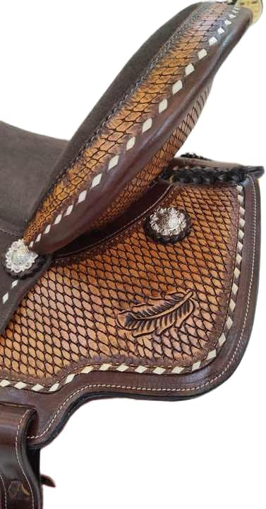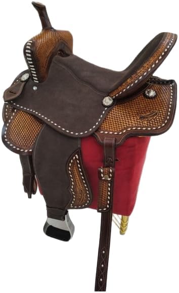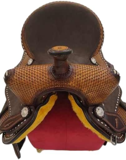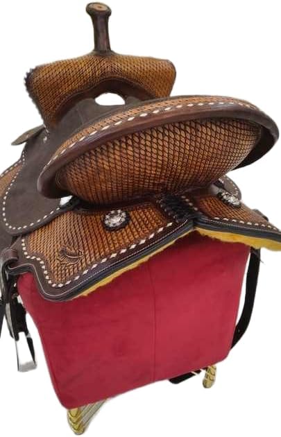 Experience the timeless appeal of a classic saddle. Crafted with meticulous attention to detail, this saddle is designed to provide both rider and horse with optimal comfort and support. The high-quality leather construction ensures durability and longevity, while the ergonomic design promotes proper positioning and balance. Whether you're hitting the trails or competing in the show ring, this saddle will become your trusted companion, allowing you to ride with confidence and style. With its sleek lines and traditional aesthetic, it's a sophisticated choice for equestrians of all levels. *** Girth Cinch, Back Cinch, Saddle Pad, and Horse Bit NOT INCLUDED *** Saddles are an essential piece of equipment for any equestrian, providing the crucial connection between rider and horse. Crafted with care and precision, a high-quality saddle offers comfort, support, and control for both the rider and the animal. Whether you're a seasoned competitor or a casual trail rider, finding the right saddle can make all the difference in your riding experience. With a wide range of styles and materials available, from classic English to rugged Western designs, there's a saddle to suit every discipline and preference. Invest in a well-made saddle, and you'll enjoy countless hours of enjoyable and secure riding adventures. Premium Quality leather. Soft Fleece Underside, Fully Hand Carved. Beautiful Floral Weave Leather Design on Pommel, Cantle, Skirt, Fender, Stirrups, "TOOLING - FULLY HAND TOOLED FLORAL DESIGN ", Soft fleece underside. Our horse tacks are built on strong wooden trees which will have less pressure on your horse's back and provide rider comfortable seating. 100% authentic handmade saddle. Expertise in all equestrian products, each product in our store goes through stringent quality check and are handmade. This premium all-around barrel saddle is perfect for any discipline whether you are turning and burning at the rodeo, or out for a leisurely trail ride! This saddle features a comfortable, thickly-padded Leather seat that will grip you into the seat when going around the barrels. The saddle also features numerous ties for accessory attachments, such as saddlebags, for when you are out on the trail or around the ranch. The saddle has a classic studded trim around the edges for added appeal, along with shiny silver sun conchs that make this saddle stand out from the rest. The well-padded fleece underside ensures your horse stays comfortable while helping to eliminate pressure points. Saddle Measurements & Specifications - Color -: As Per Picture Gullet-: 10": 5.5"; 12" to 13": 6.5" 14" to 18" 7" FQHB. Skirt-: 26.5”, Horn-: 3.5”, Swell-: 12.5”, Cantle-: 4.5”, Stirrups-:28 - 38”, Weight-: 26 LBS.