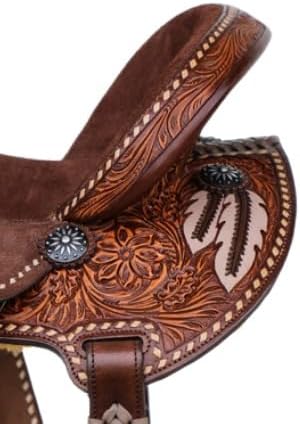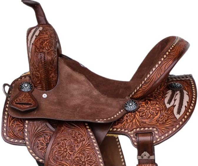Experience the timeless appeal of a classic saddle. Crafted with meticulous attention to detail, this saddle is designed to provide both rider and horse with optimal comfort and support. The high-quality leather construction ensures durability and longevity, while the ergonomic design promotes proper positioning and balance. Whether you're hitting the trails or competing in the show ring, this saddle will become your trusted companion, allowing you to ride with confidence and style. With its sleek lines and traditional aesthetic, it's a sophisticated choice for equestrians of all levels. *** Girth Cinch, Back Cinch, Saddle Pad, and Horse Bit NOT INCLUDED *** Saddles are an essential piece of equipment for any equestrian, providing the crucial connection between rider and horse. Crafted with care and precision, a high-quality saddle offers comfort, support, and control for both the rider and the animal. Whether you're a seasoned competitor or a casual trail rider, finding the right saddle can make all the difference in your riding experience. With a wide range of styles and materials available, from classic English to rugged Western designs, there's a saddle to suit every discipline and preference. Invest in a well-made saddle, and you'll enjoy countless hours of enjoyable and secure riding adventures. Premium Quality leather. Soft Fleece Underside, Fully Hand Carved. Beautiful Floral Weave Leather Design on Pommel, Cantle, Skirt, Fender, Stirrups, "TOOLING - FULLY HAND TOOLED FLORAL DESIGN ", Soft fleece underside. Our horse tacks are built on strong wooden trees which will have less pressure on your horse's back and provide rider comfortable seating. 100% authentic handmade saddle. Expertise in all equestrian products, each product in our store goes through stringent quality check and are handmade. This premium all-around barrel saddle is perfect for any discipline whether you are turning and burning at the rodeo, or out for a leisurely trail ride! This saddle features a comfortable, thickly-padded Leather seat that will grip you into the seat when going around the barrels. The saddle also features numerous ties for accessory attachments, such as saddlebags, for when you are out on the trail or around the ranch. The saddle has a classic studded trim around the edges for added appeal, along with shiny silver sun conchs that make this saddle stand out from the rest. The well-padded fleece underside ensures your horse stays comfortable while helping to eliminate pressure points. Saddle Measurements & Specifications - Color -: As Per Picture Gullet-: 10": 5.5"; 12" to 13": 6.5" 14" to 18" 7" FQHB. Skirt-: 26.5”, Horn-: 3.5”, Swell-: 12.5”, Cantle-: 4.5”, Stirrups-:28 - 38”, Weight-: 26 LBS.