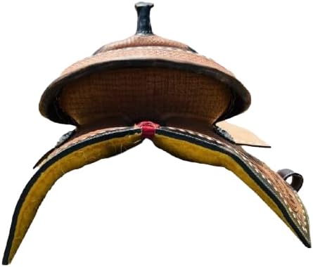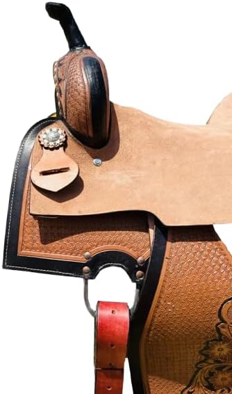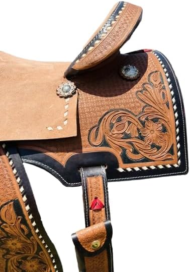 Saddles are an essential piece of equipment for any equestrian, providing the crucial connection between rider and horse. Crafted with care and precision, a high-quality saddle offers comfort, support, and control for both the rider and the animal. Whether you're a seasoned competitor or a casual trail rider, finding the right saddle can make all the difference in your riding experience. With a wide range of styles and materials available, from classic English to rugged Western designs, there's a saddle to suit every discipline and preference. Invest in a well-made saddle, and you'll enjoy countless hours of enjoyable and secure riding adventures. ***Girth Cinch, Back Cinch, Saddle Pad and Horse Bit NOT INCLUDED*** This saddle features a beautiful premium leather with a classic hand carved fern leaf and basket weave tooling. It also features numerous ties with silver Conchos for easy accessory attachment, and padded ergonomic stirrups for optimum rider comfort. This saddle also features our new high-tech close contact skirt for enhanced horse and rider communication. The suede seat is well-padded and features a decorative quilt stitched pattern while the underside has a well-padded fleece underside for horse’s comfort. 100% Premium Leather Hand Carved Fern & Basket Tooling Quilt Stitched Padded Suede Seat Padded Ergonomic Stirrups Numerous Ties For Accessory Attachment Shiny Silver Sun Conchos Well-Padded Fleece Underside Well Balanced Wood & Fiberglass Tree Saddle. Saddle Specifications:- Color: As Per Picture Pony Saddle Measurements:- Size: 10-12 inches Seat. Gullet: 5 FQHB. Skirt: 22-25. Horn: 2.5. Swell: 10. Cantle: 3.5. Stirrups: 26-35. Weight: 18 to 22 lbs. Adult Saddle Measurements:- Size: 14-18 inches Seat. Gullet: 7 FQHB. Skirt: 25-28. Horn: 3.5. Swell: 12. Cantle: 4. Stirrups: 30-40. Weight: 22-26 lbs.
