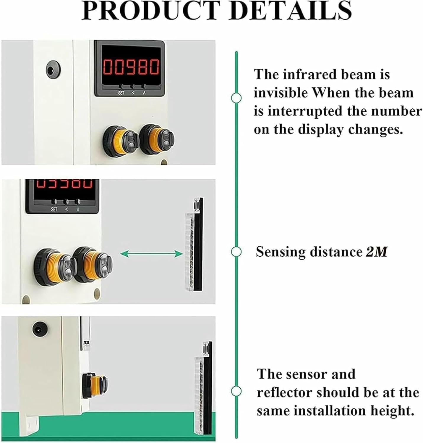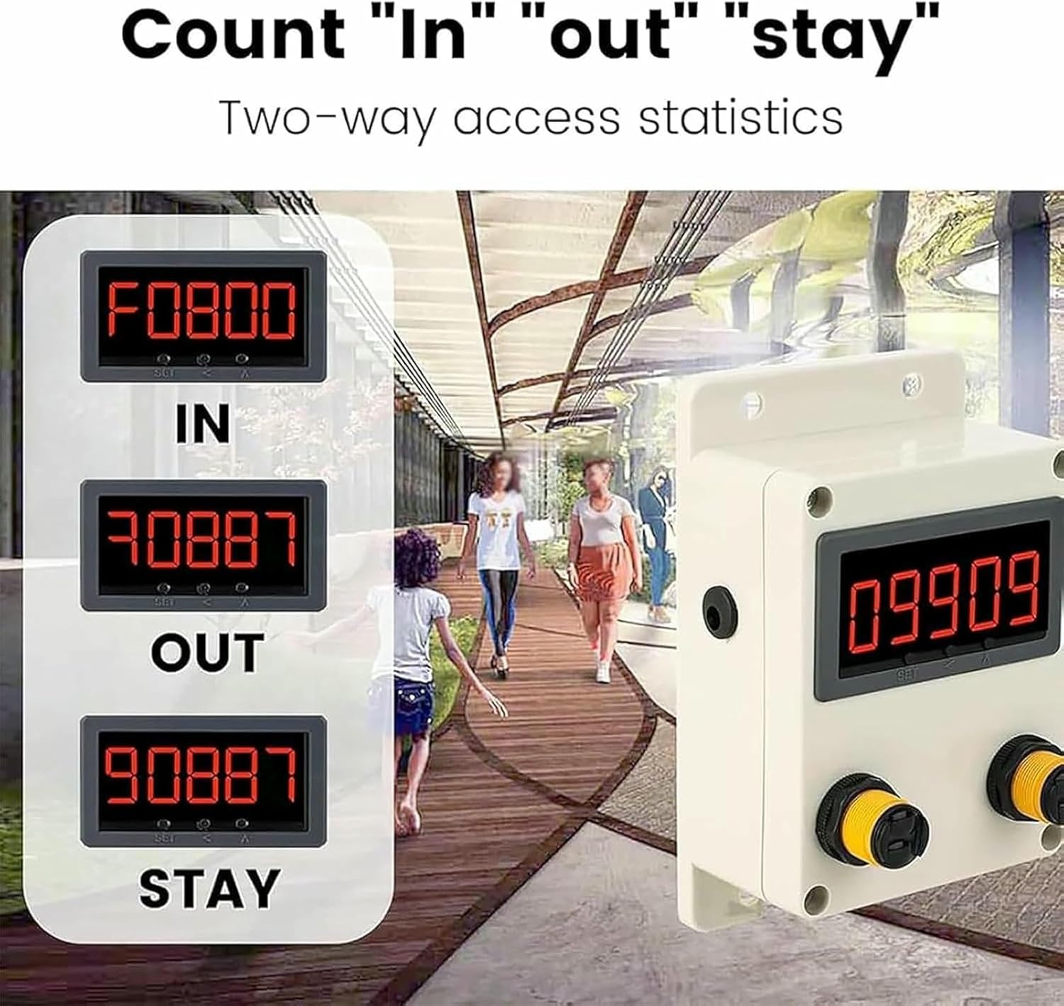 Product description - Due to the principle characteristics, the quantity is for reference and analysis only and cannot be 100% accurate - Multiple flows of people passing through the sensing point at the same time will only be counted once - If there are always people standing at the sensing point, the second count cannot be counted Specifications: Name: Visitor Counter Counting range: -19999 to 99999 Sensing distance: 2 m Real-time number of people in the store: +1 when entering, -1 when leaving Overall size: 150x90x55 mmPackage List: Visitor Counter *1 Reflector *1 Adapter *1