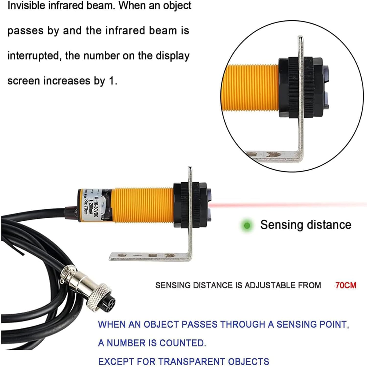 Features 6-digit display large screen, counting range 0-999999; Power failure memory, no data loss when power failure; Accurate counting, strong anti-interference ability; Counting Requirements : 1. Objects are counted by induction points, except for transparent objects 2. Note that the probe is installed at a suitable height. When there is no object, the probe does not sense the passage of an object before sensing and counting. 3. There must be intervals when objects pass, and objects cannot overlap Product parameters Product name: 3-inch 6-digit screen counter Working voltage: DC12-24V Induction distance 0-70CM adjustable Counting range: 0-999999 Single font size: 42*70mm Weight: about 2kg Packing list: counter x1