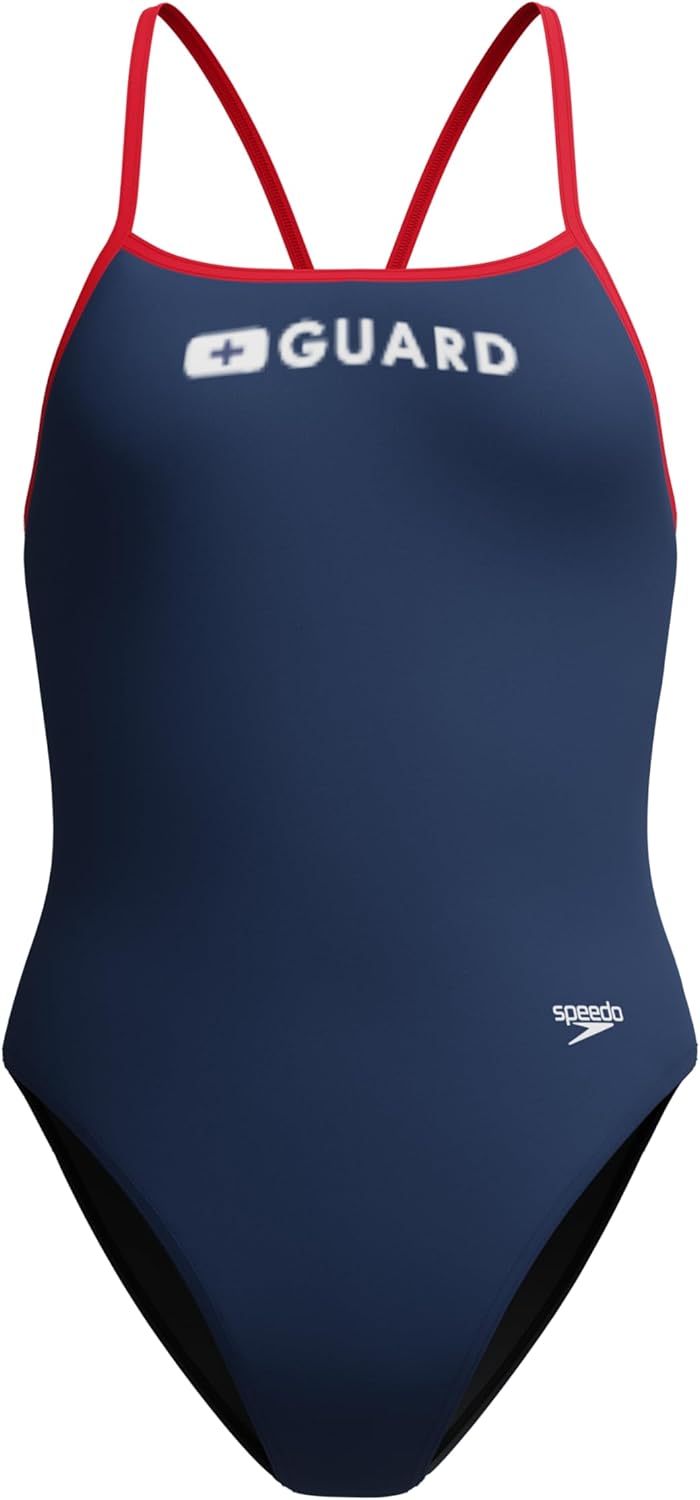Speedo equals better fit, performance, quality, and innovation. The guard energyback is a popular thin strap silhouette with guard logo, inspired by those who save lives. The suit features our exclusive endurance plus chlorine resistant fabric, but in endurance lite, which is 10 percentage lighter weight for less drag but the same long lasting qualities. In fact, the suit lasts 20 times longer than ordinary spandex, and also has our four way stretch technology for a body hugging fit and softer feel. So no bag and sag, and it looks like new for longer. Look and feel your best in or out of the water, while you play, train or win in speedo, the choice of champions.