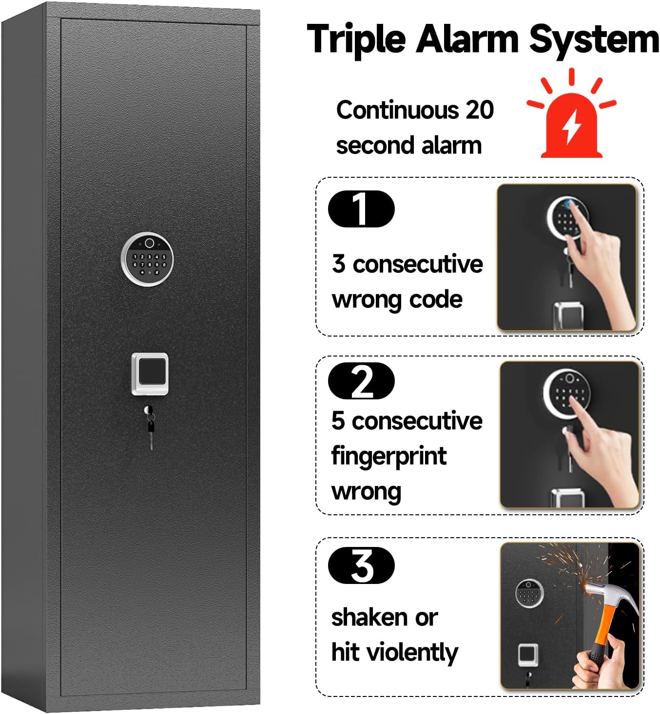 Upgrade your home security with our Biometric Gun Safe for Rifles & Pistols — designed for fast access, reliable protection, and peace of mind. Built from heavy-duty solid steel, this large capacity gun cabinet holds 10–15 long guns plus handguns, with adjustable shelves to accommodate scopes, optics, and accessories. The advanced biometric fingerprint sensor unlocks in just 0.8 seconds, giving you instant access in emergencies while keeping firearms securely locked away from children and unauthorized users. For added security, you can use the keypad or backup keys as alternative entry methods. Unlike many safes that require hours of assembly, ours comes fully assembled and ready to use. Simply place it in your preferred location, secure it with the included anchor kit, and start protecting your firearms, ammo, and valuables. Perfect for garages, basements, and closets, this gun safe doubles as a multi-purpose home security locker — ideal for storing important documents, cash, jewelry, and electronics. Whether you’re a hunter, a sport shooter, or a responsible gun owner, this safe offers the right balance of speed, security, and convenience. Key Features: Biometric fingerprint access in 0.8 seconds Fits 10–15 rifles and pistols with adjustable racks Child-safe locking system to prevent unauthorized access Heavy-duty steel construction for long-lasting durability No assembly required — ready to use out of the box