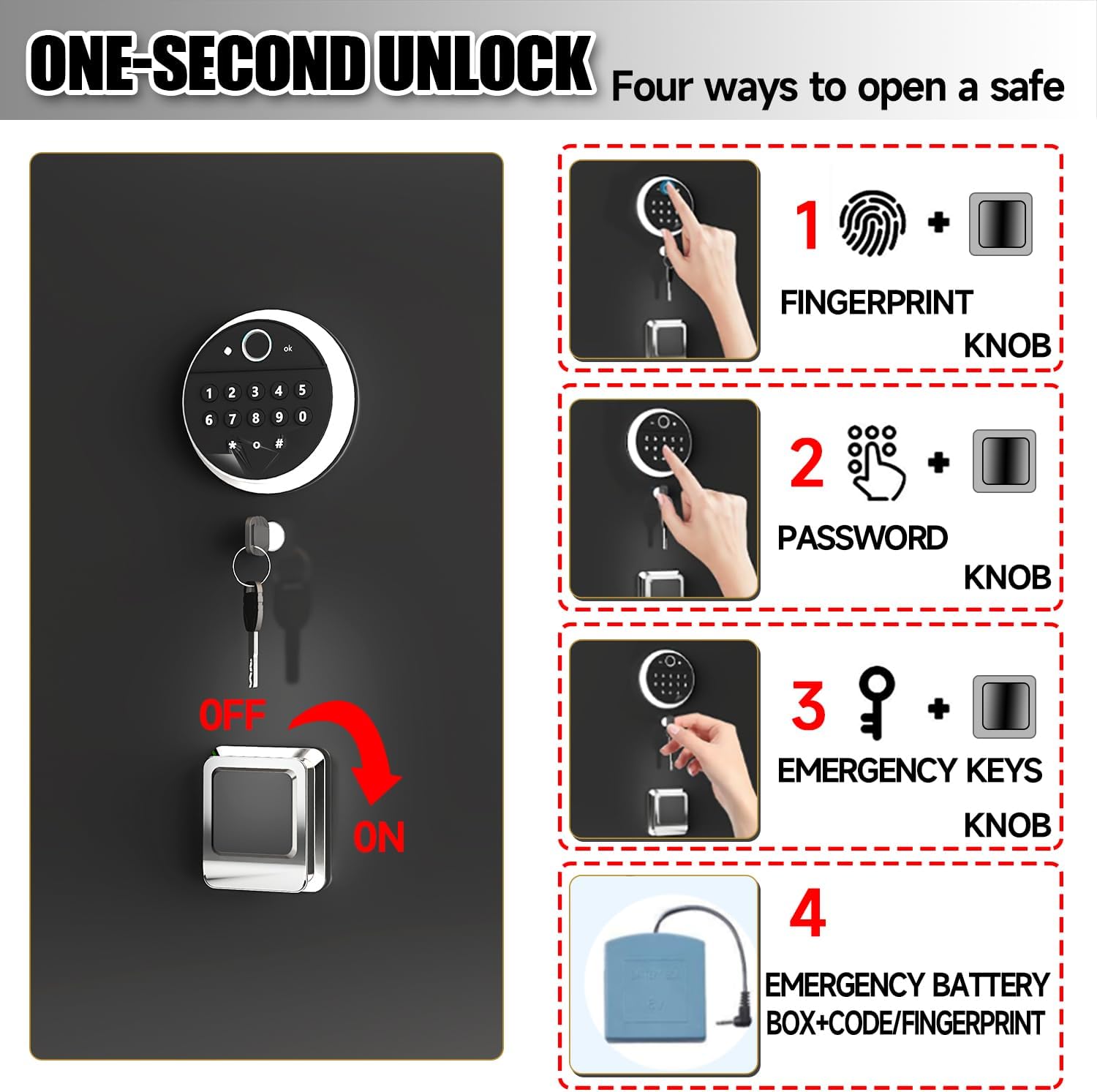 | Lock Type | Biometric, Electronic Combination Lock, Key |