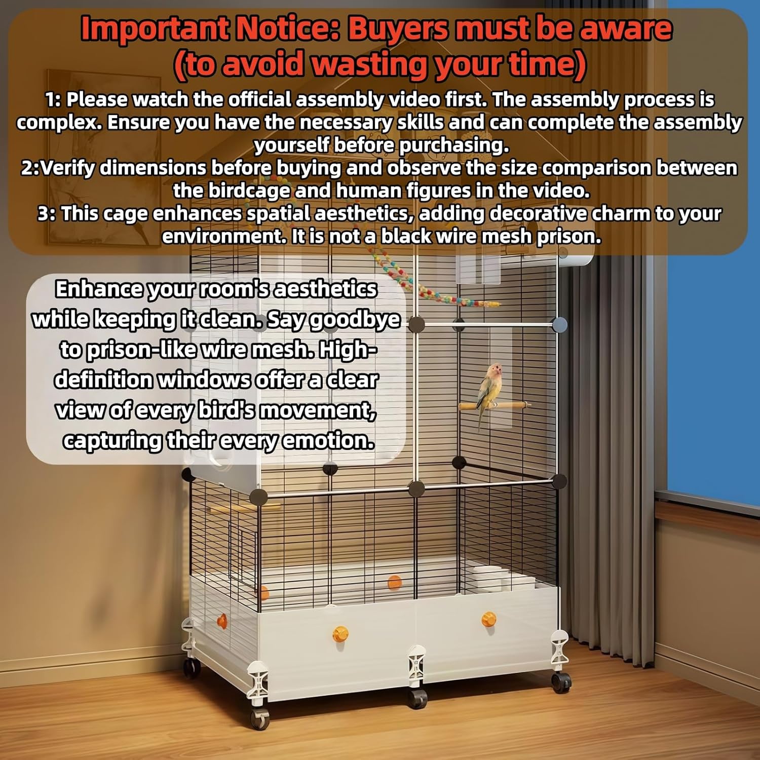 【A Birdcage for Soaring High】To prevent birds from losing their natural instincts, the birdcage has been designed with an expanded space. The spacious area grants the birds more freedom, allowing them to fully exhibit their natural behaviors and no longer suffer from confinement. 【Suitable for Various Bird Species】This birdcage is meticulously crafted from thickened metal, boasting exceptional durability and outstanding waterproof performance. It provides a safe and comfortable habitat for various feathered friends such as budgerigars, parrots, lovebirds, cockatiels, cockatoos, conures, canaries, parakeets, mynas, pigeons, and more. 【With Splash-Proof Baffles】Splash-proof baffles are installed around the cage body, effectively preventing grain from spilling out and soiling the floor. Whether during feeding or bird droppings, the environment can be kept clean at all times. 【Six-Wheel Design】Equipped with six wheels, it can be easily moved to any position. You can even push it outdoors, allowing the birds to enjoy sunbathing and breathe in the fresh air of nature. 【Roof for Storage】The roof can also be used for storage, where you can place the birds' items, eliminating the need to search for bird supplies everywhere. You can get what you need at any time when you want to feed them. 【Multiple Free Gifts】Purchase now to receive a swing, birdhouse, climbing ladder, food bowl, water bowl, as well as perches and standing boards. One-stop shopping for all bird-appropriate supplies, no need for additional purchases. 【With Cleaning Tray】Built-in pull-out cleaning tray for easy cleaning of bird droppings and residual grain. Simply pull out the tray and rinse it with water to make it clean as new. 【Horizontal Bar Cage】The horizontally arranged bars are convenient for birds to grasp, better conforming to their physiological structure, effectively protecting their claws and preventing inflammation, allowing pets to play to their heart's content. 【Highly Ornamental】No need to look at the birds through the wire mesh anymore; you can more clearly understand the birds' emotions of joy, anger, sorrow, and happiness. 【Easy Installation】Adopts a detachable design for convenient daily cleaning; the cage bottom is equipped with a pull-out plastic sliding tray for more worry-free cleaning; each panel can be disassembled, enhancing ease of use and keeping the pet's living environment clean at all times. Our birdcage can be easily assembled with just a hammer, no other tools required. This will reduce the time you spend on cleaning and assembly, allowing you to have more energy to interact with your pets. 【Please Give Birds More Happiness】Birds are also our good friends. Please give them a happy and warm home, allowing them to spread their wings and fly high, and happily enjoy the warmth you bring.