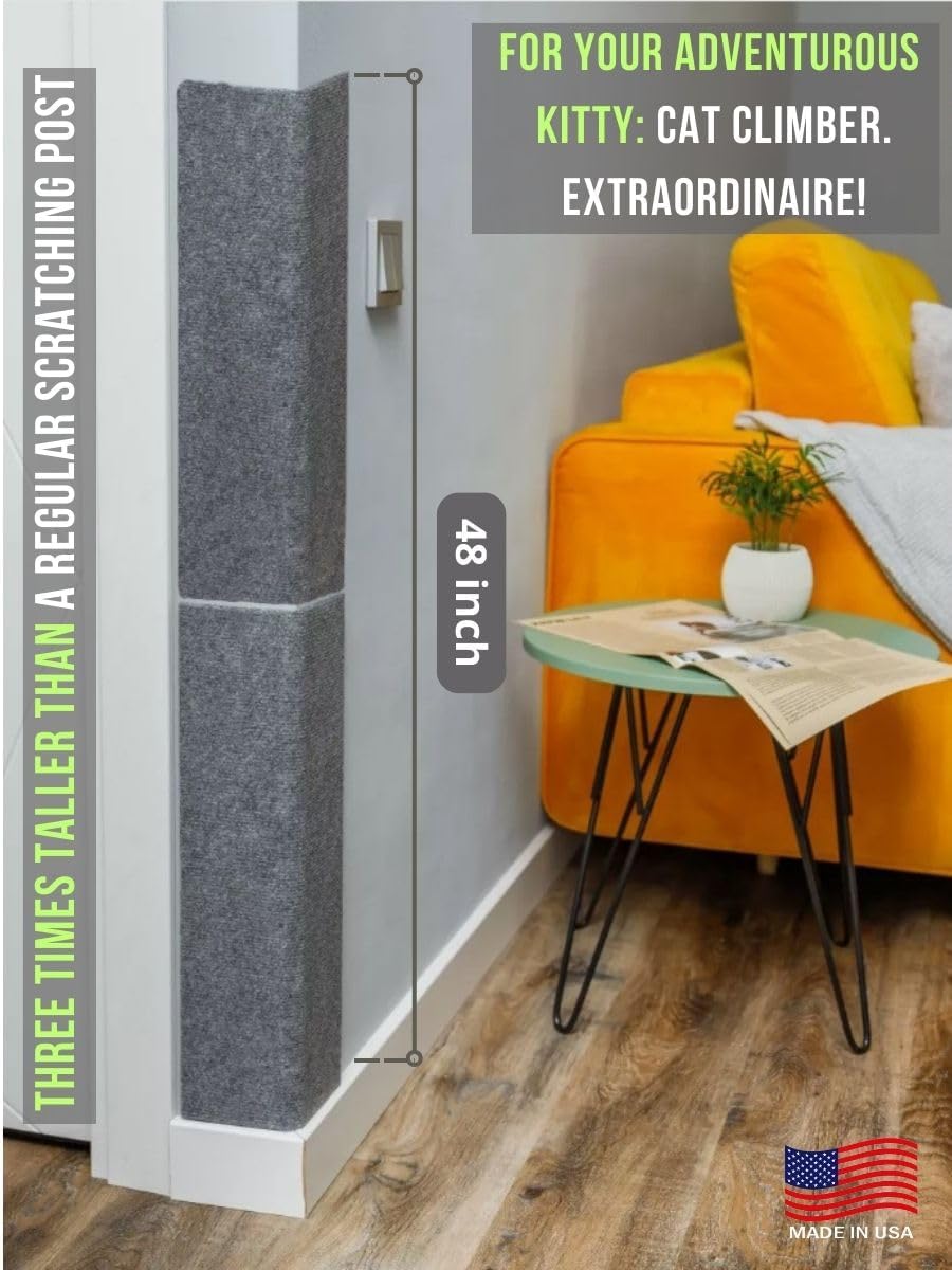 Cat scratching posts. Versatile use: our cat scratching post is suitable for wall or floor mounting, making it ideal for all corners and spaces in your home, including doors and windows. Perfect size for all cats: the 24" x 12" x 0.25" size is suitable for both adult cats and kittens. Adjustable height: easily adjust the height according to your cat's preference. Easy installation: securely fasten it with four adhesive tapes, making it compact. Silent installation: no nails or self-tapping screws or additional tools required. When mounted on the wall, it remains stable and creates minimal noise. Our cat scratching post contains a lure - natural catnip. What is it for? It allows you to train your pet to your chosen claw sharpening spot, leaving your furniture safe. Give your cat a place where they can satisfy their instincts. Extended life: two sides of use, simply flip it over to double its life span and provide your cat with a fresh scratching surface. Soft and Safe: the smooth and soft surface ensures your cat's comfort and safety with every scratch. Durable Made in USA Construction. We are proud that our cat scratching posts are made in the USA, ensuring reliability and durability.Make a wise choice and treat your cat and yourself to a luxurious and practical cat scratching post! cat corner scratcher, corner cat scratcher, cat corner scratcher for wall, corner scratchers for indoor cats, cat scratcher corner, cat scratch corner, cat wall scratcher corner, cat scratching corner, cat scratch mat, cat scratcher mat, cat scratch rug, cat scratching rug, cat wall scratcher, wall cat scratcher, wall mounted cat scratcher, wall scratchers for indoor cats, cat scratcher wall