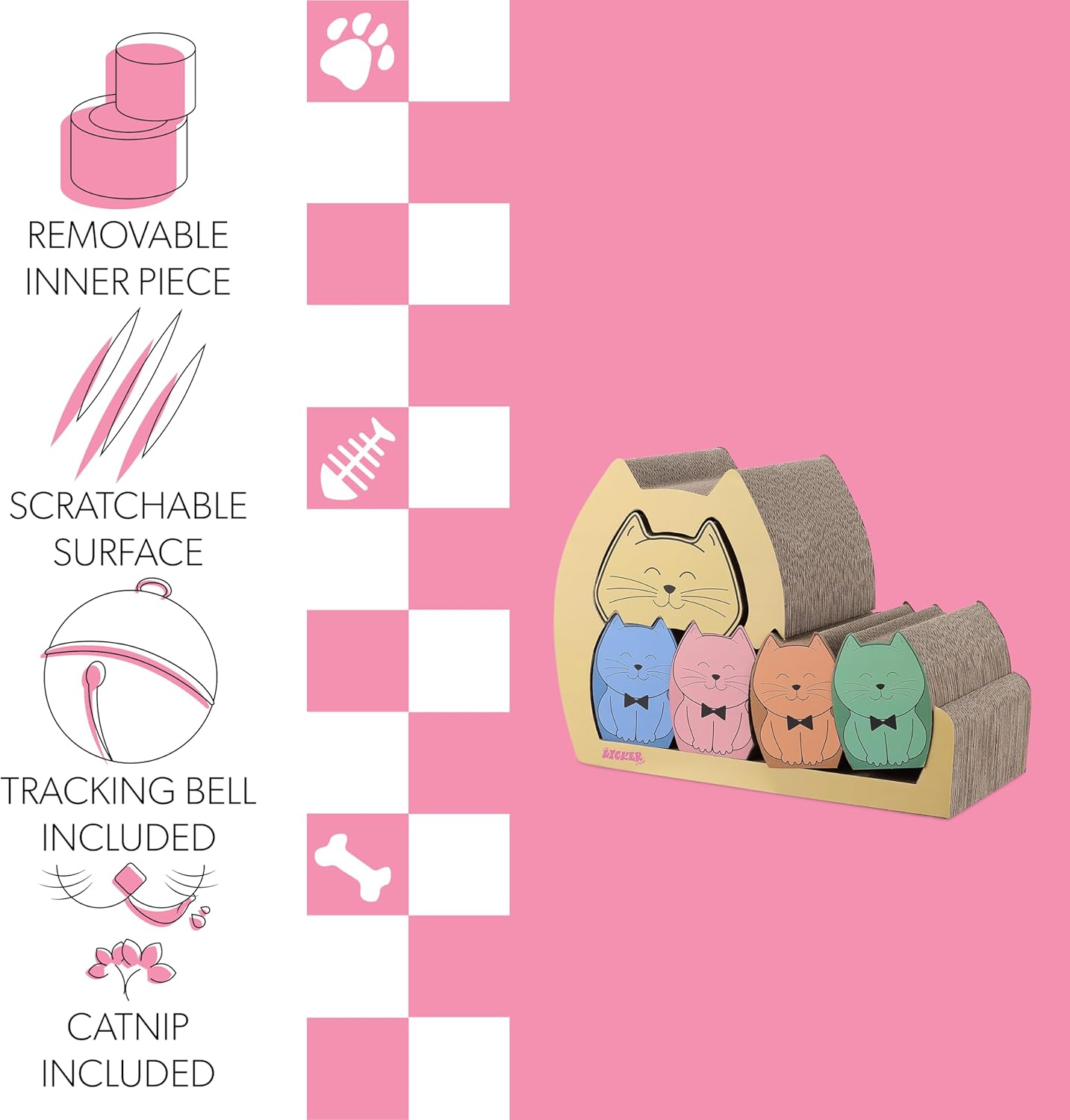 Keep your cats active and healthy with our five-piece scratch and play set. The adorable cat family design is made from corrugated cardboard that kitties love. Simply pull out separate kitten scratchers to create a play tunnel for stalking or hiding out.