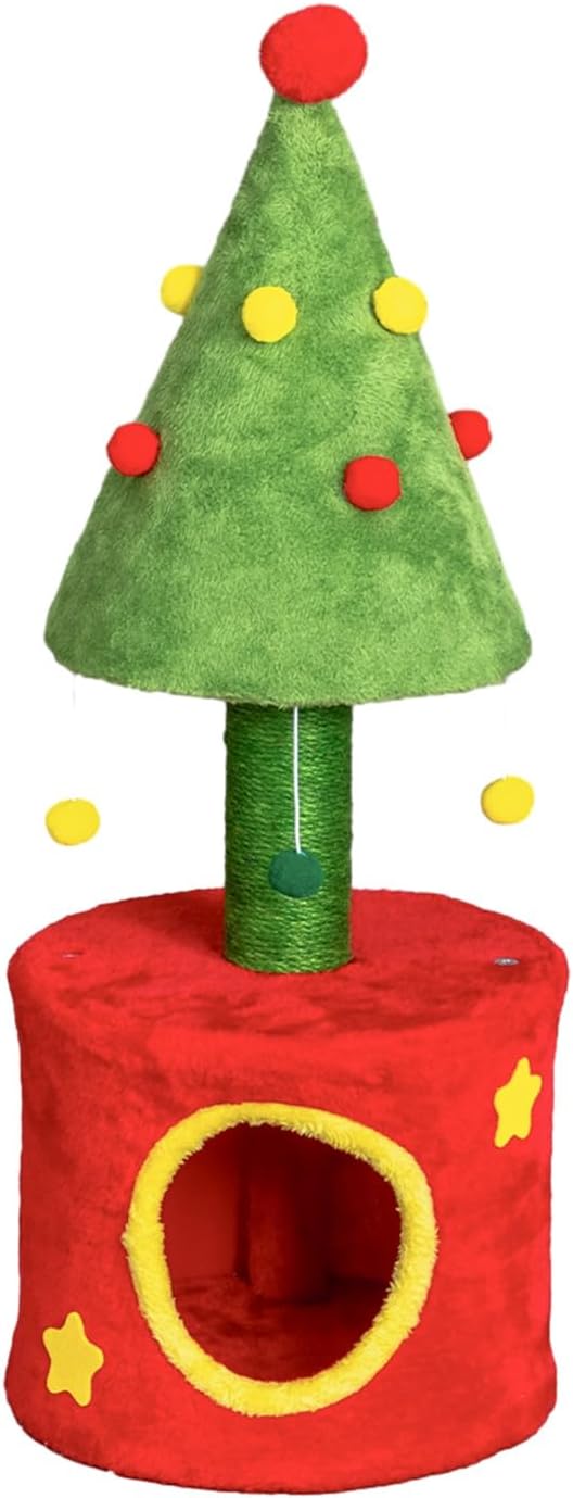Introductions: Give your feline friend the purr-fect holiday gift with this Christmas Tree Cat Scratcher Tower. Designed in the festive shape of a Christmas tree, this eye-catching cat scratcher not only enhances your seasonal décor but also satisfies your cat's natural scratching and climbing instincts. With a cozy fleece-covered base, along with tightly wrapped sisal rope all over the tree for claw-friendly scratching, it offers both comfort and fun. The stable construction ensures peace of mind during energetic play, making this scratch tower a cheerful and functional addition to your indoor space. Features: 1. Festive Christmas Tree Design: Inspired by classic holiday décor, this cat tower brings a fun, seasonal twist to your pet's play area while blending beautifully with your Christmas decorations. 2. Pet-Safe Sisal Rope for Scratching: Crafted with durable, high-quality sisal rope, this cat scratcher encourages healthy scratching habits while keeping your furniture safe. The materials are non-toxic and safe for all cats. 3. Soft & Cozy Fleece Base: The base is fully wrapped in soft fleece fabric, providing a warm and comfortable surface for your cat to lounge, stretch, or nap in between play sessions. 4. Sturdy Construction with Stable Base: The wide and stable base prevents tipping during play, making it a reliable scratch post for even the most active cats. Enjoy worry-free fun and lasting durability season after season. 5. Easy to Assemble: The tree comes with clear, step-by-step instructions that allow for fast, hassle-free assembly so your cat can start enjoying their new tree right away. Specifications: 1. Overall Dimensions: (15.7 x 15.7 x 31.5) in / (40 x 40 x 80) cm 2. Base Dimensions: (15.7 x 15.7) in / (40 x 40) cm 3. Color: Grass Green Package Includes: 1 x Christmas Tree Cat Scratcher Tower