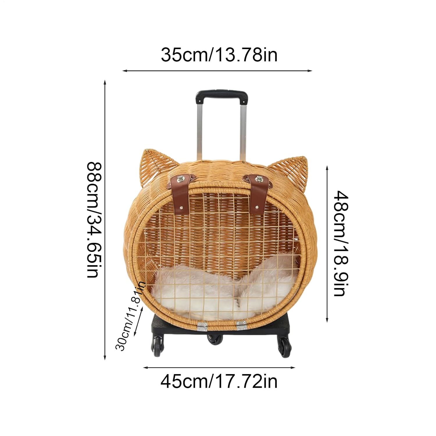 This versatile pet carrier combines a retro aesthetic with practical features like a telescopic handle and breathable design, making it perfect for daily walks, travel, or outdoor excursions, such as picnics and camping. Whether you're heading to the beach or shopping, this cart is an excellent choice for transporting medium-sized animals like puppies kittens or bunnies.Specifications:Name: Cat-shaped pet trolleyMaterial: PE rattan, iron frameDimensions: approximately 45 x 30 x 48 cm (17.72 x 11.81 x 18.9 inches), height with pull bar: 88 cm (34.65 inches), base 35 cm (13.78 inches)Net Weight: 4020 g, Gross Weight: 4500 gSuitable for pets weighing up to 12.5kgPacking List:1 x Stroller for Dogs1 x padNotes:1. Due to the different monitor and light effects, the actual color of the item might be slightly different from the color shown in the pictures.2. Please forgive a slight measuring deviation due to manual measurement.