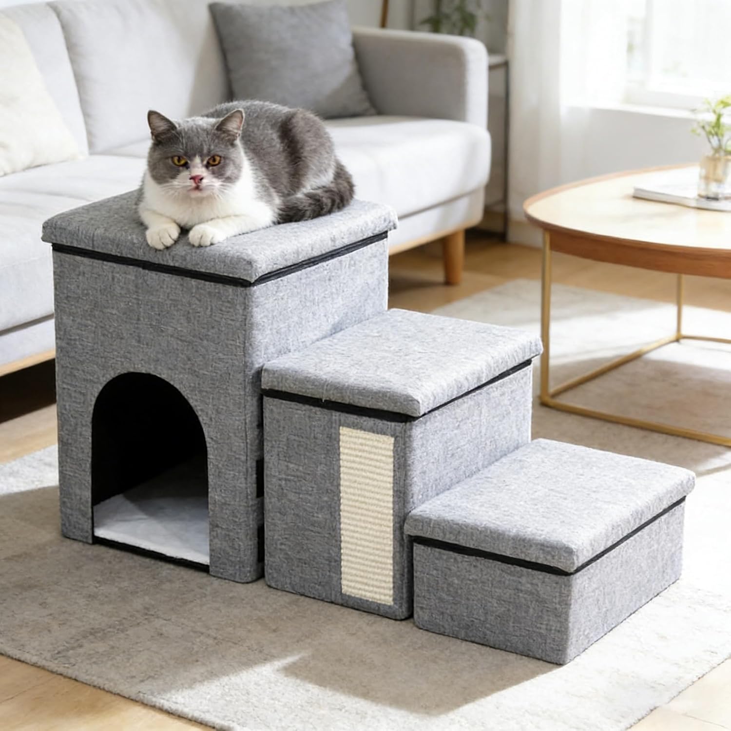 Product DescriptionGive your pet a safer, easier way to reach favorite spots with these multi-function cat stairs with storage. Designed for indoor cats and small dogs, the 3 step pet stairs provide a gradual climb to beds, sofas and window perches, reducing stress on joints and helping kittens, senior cats and small pets move with confidence.The tallest step features an enclosed cat condo with an arched doorway that creates a quiet hideaway cat house. Inside, your cat can curl up on a soft pad and enjoy a private cat bed while still feeling close to the family. The flat, cushioned tops of each step double as comfy perches where pets can lounge and watch the room.Each step of the cat stairs lifts to reveal a roomy storage box. Use the hidden compartments to store cat toys, blankets, grooming tools or extra supplies. This smart storage pet stairs design keeps your space tidy while keeping essentials right where you need them.A vertical scratching panel on the middle step turns the unit into practical cat furniture. The textured surface satisfies natural scratching instincts and helps protect couches, chairs and carpets by drawing your cat to a dedicated scratching area.Wrapped in soft, wrinkle-resistant fabric, the cat stairs feel comfortable to the touch and blend easily with modern home décor. The sturdy inner structure supports everyday use, yet the lightweight construction makes it simple to move the cat steps from bed to sofa or window seat.The modular layout lets you use all three cat stairs together or separate them to fit different corners of your home. Whether you need cat stairs for a high bed, extra pet steps for a couch, or an all-in-one cat condo with storage and scratching post, this versatile cat stairs set gives your pet comfort, security and fun in one compact piece of cat furniture.