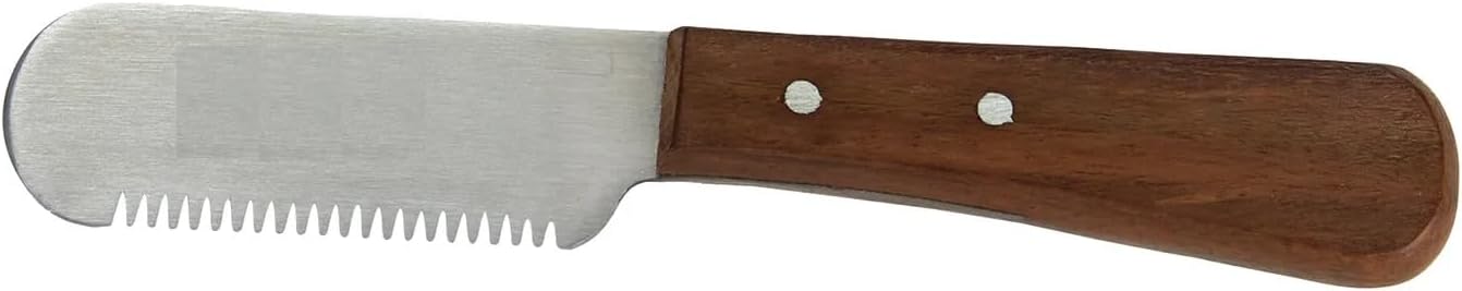 Our Carding Stripping Knives removes the soft, dead undercoat from a dog's coat without cutting the topcoat. Grooves that grab and pull out the hair that is ready to be shed, helps prevent matting and promotes healthy skin and coat growth. Beautiful wooden handle with strong steel blade for years of professional use. Includes protective sleeve. Designed for Right Hand. Care: Keep in sleeve or proper personal case holder for storage. Handle with care and keep away from moisture when storing. Materials: Metal/Wood Made in Pakistan Available in Fine, Coarse or a Set of Both Knives.