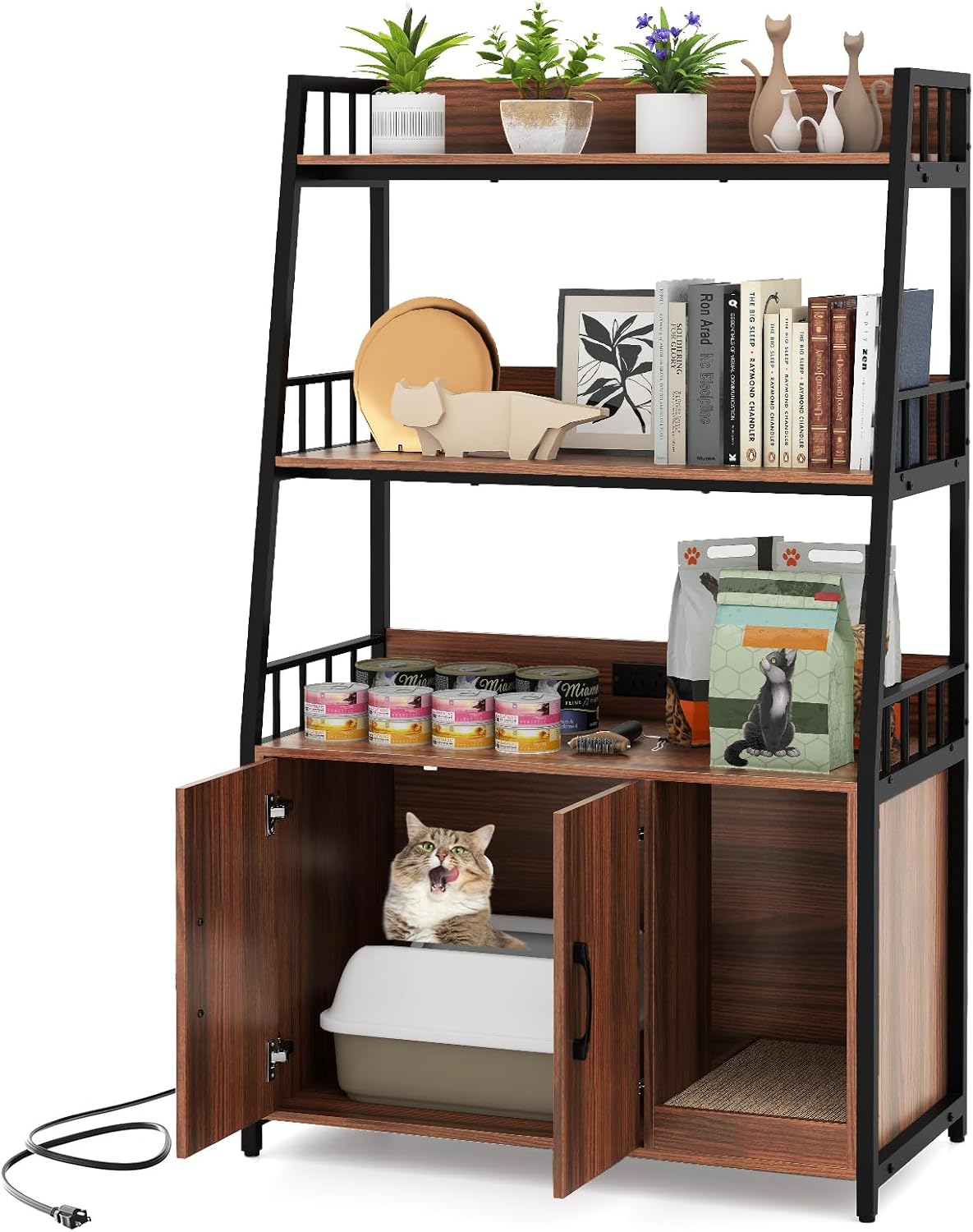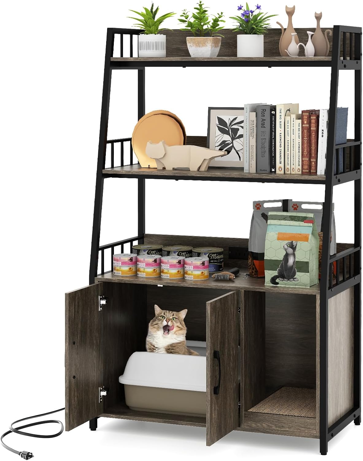 DescriptionAre you looking for a versatile and practical cat furniture solution? Our multipurpose cat cabinet offers a private and comfortable space for your feline friend. Its versatile bottom cabinet that can be used as a cat toilet enclosure or a cozy cat condo. The practical charging station includes 2 AC outlets, 1 USB port, and 1 Type-C port, allowing you to keep your phone, laptop, and other gadgets powered up. Besides, the 3-tier open shelves offer ample storage space for pet supplies, decorations, books, toys, and more, with side and back baffles to prevent items from falling. The winding entry path prevents cat litter from being dragged out, and the scratching board satisfies your cat’s natural scratching instinct. Hence, our hidden cat washroom is what you want!FeatureServes as cat toilet enclosure or cozy cat condo with ample spacePractical charging station with 2 AC outlets, 1 USB port and 1 Type-C port3-tier open shelves offer ample storage space for your itemsEquipped with side and back baffles to prevent items from fallingSturdy frame constructed with robust metal and thickened board for durabilityAdjustable foot pads and anti - tipping devices ensure stability and safetyWinding entry design prevents cat litter from being dragged outCat scratching board satisfies cat's scratching instinct and protects furniture3 air vents effectively increase air ventilation to reduce smellsPower cord of 4.9 FT provides convenient chargingAssembly requiredSpecificationColor: Rustic Brown + Black/Walnut + Black/Gray Oak+ BlackMaterial: MDF + Engineered Wood + MetalProduct Dimensions: 31.5” x 15.5” x 52”(L x W x H)Cabinet Inner Dimension: 19” x 15” x 17.5”(L x W x H)Top Storage Shelf Size: 30” x 10”(L x W x H)Middle Storage Shelf Size: 30” x 12.5”(L x W x H)Tabletop Size: 30” x 15”(L x W x H)Scratcher Size: 14” x 8.5” x 2”(L x W)Cabinet Weight Capacity: 88 lbsPower Cord Length: 4.9 ftNet Weight: 56 lbsPackage includes:1 x Cat Litter Box Enclosure1 x Anti-tipping Kit1 x Cat Scratcher1 x User’s Manual