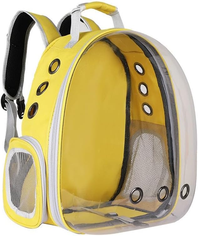 Travel in style with your furry friend using this innovative pet backpack carrier. Featuring a unique transparent dome design with a vibrant yellow trim, this carrier offers your small cat or dog a comfortable and secure way to join your adventures. The spacious interior allows pets to sit, stand, or lay down naturally while enjoying panoramic views through the clear walls. Equipped with multiple ventilation holes and a breathable mesh panel, it ensures optimal airflow during walks, hikes, or travel. The durable construction includes reinforced edges and sturdy grommets for structural integrity. Perfect for small pets who love to explore, this backpack combines functionality with modern aesthetics. The padded shoulder straps provide comfort for the carrier, while the rigid bottom support gives your pet a stable platform. Whether heading to the vet, taking a stroll downtown, or embarking on an outdoor expedition, this fashionable carrier keeps your pet safe and visible while making a stylish statement.