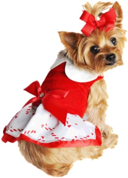 Features an adorable candy cane tulle skirt, red satin bow with rhinestone center, velvet body and white collar. Our holiday dresses also feature a built in d-ring and include a matching leash for easy walking. This one is a must have for the Holidays. Hand wash, line dry. Important Sizing Note: The measurements provided are the dimensions of the actual product, not of the pet they fit. After measuring your pet, make sure all measurements fit within the dimensions provided (with a little room to spare in the chest and neck).