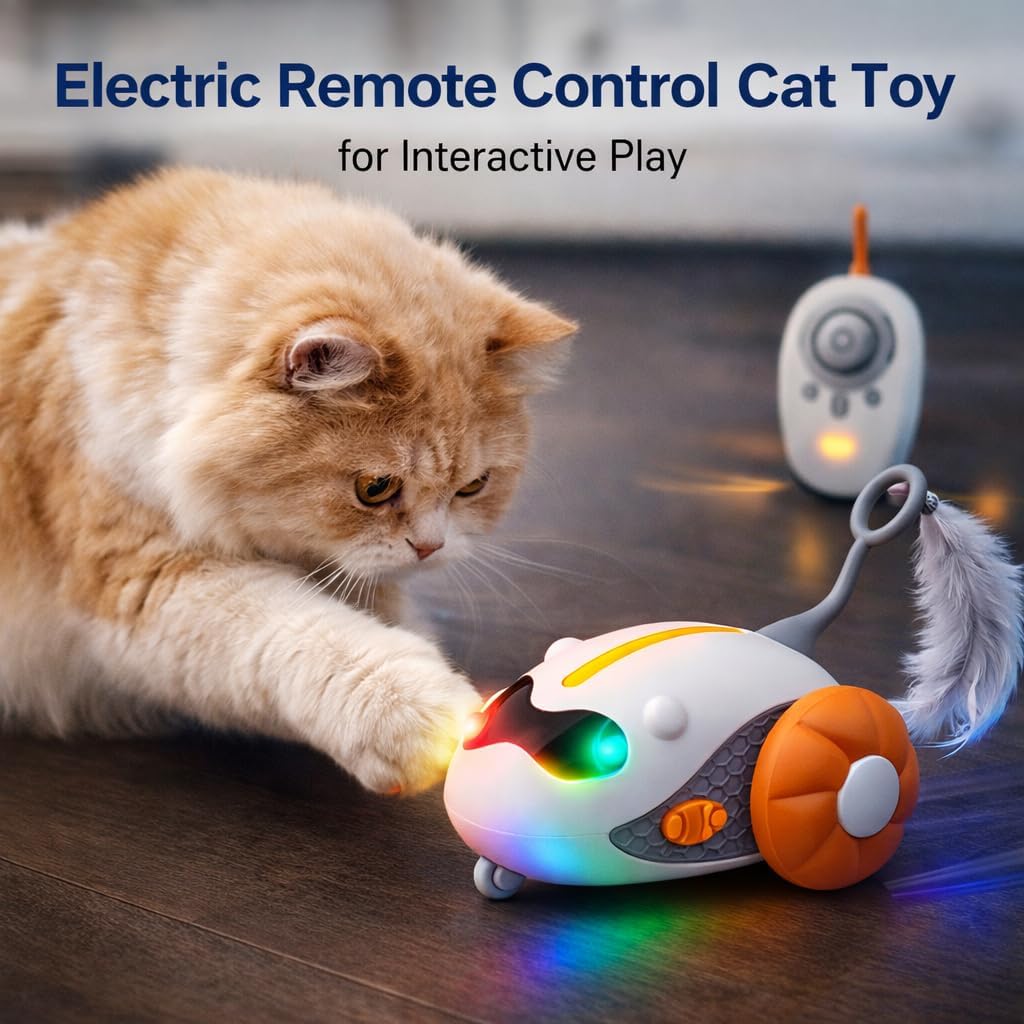 The USA CALI Electric Remote Control Cat Toy (Orange) is designed to add motion-based fun to everyday indoor play. Its mouse-inspired shape, smooth rolling movement, and glowing light effect naturally encourage chasing and interaction. With built-in obstacle detection and a self-righting roller design, the toy keeps moving around furniture and tight spaces. The rechargeable battery and detachable wheels make it simple to maintain and ready for repeat play sessions. A compact size and responsive remote control allow flexible play in living rooms, bedrooms, or open indoor areas.
