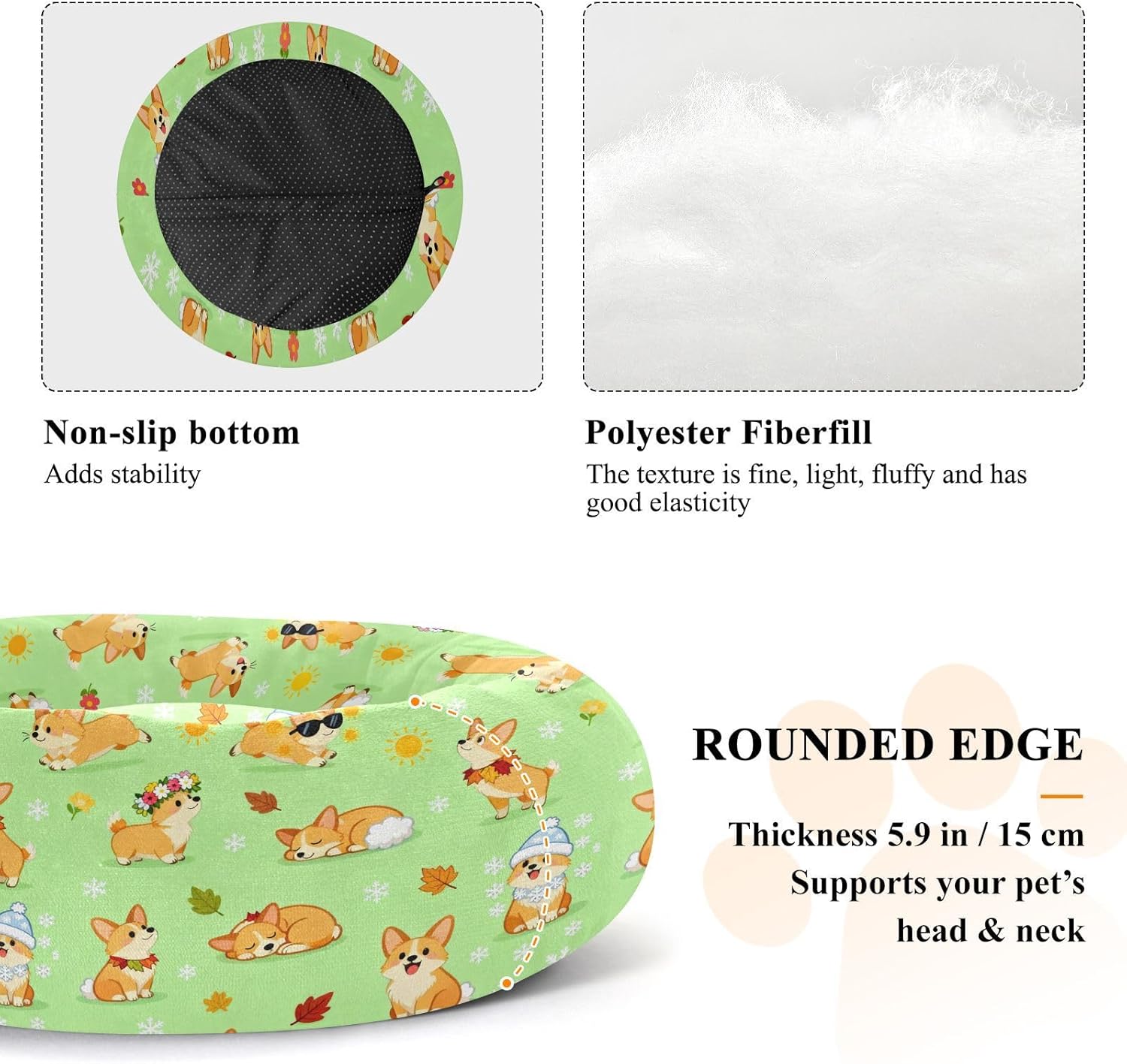 Material: Polyester + Filled Fiber + Drip Plastic. Our Cat Pillow Bed features a donut-shaped appearance design and is filled with silk-like cotton inside. It has excellent elasticity and fluffiness, providing comfortable support for pets and relieving joint pressure.Product Design: The overall shape is circular with raised edges, allowing your dog and cat to curl up for fun. Cat Pillow Bed provides support for the head and neck, promoting a sense of security without worry.Applicable Scenarios: This comfortable bed can be used by pets such as cats and dogs. Cat Pillow Bed can be used in scenarios such as living rooms, floors, sofas, cages, and cars.Washing Instructions: Hand wash or machine wash. Air dry in the shade. Please use a mild neutral detergent.