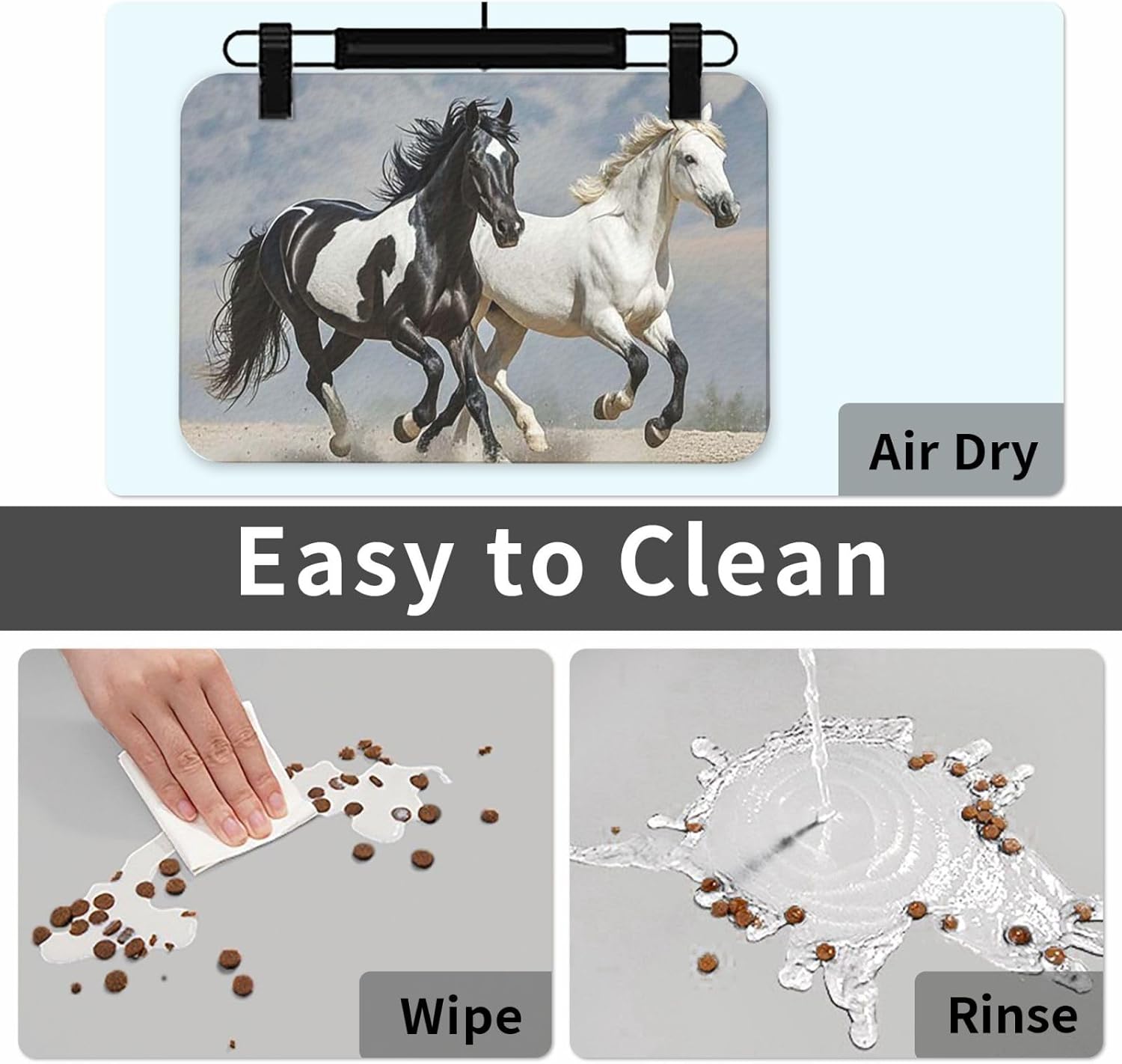 Easy Clean & Easy Storage:1.Use the Black and White Horses Running Pet water mat for dog to set up a separate feeding area for your pet.We offer a variety of sizes to fit all types of pet bowls, so you can find the perfect size mat for your pet bowl.2.When choosing a size, make sure there is at least 5 inches of clearance between the bowl and the edge of the mat. For fast-eating pets, a larger mat will keep food and water from spilling.3.After using this mat for a while, you just need to clean quickly just by rising. And just dry the bottom and put it into the next use. Absorbent pet placemat can be rolled up for easy portability and space saving.4.Absorbent pet feeding mat are available in a variety of colors to fit most interiors, you can choose your favorite color. An easy care pet accessories stuff for puppy dog or cat.