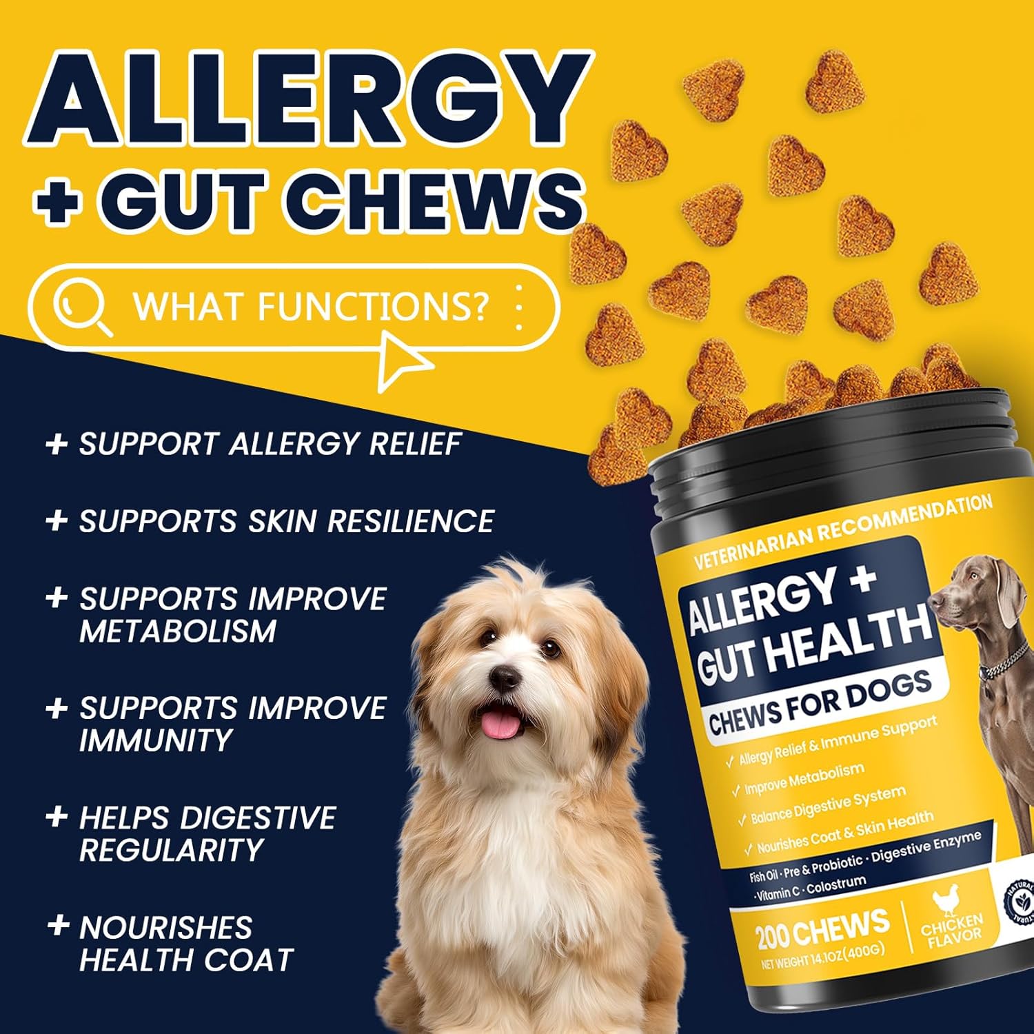 Daily Allergy & Immune Support for DogsProbiotics for dogs contain Fish Oil, Vitamin C and Colostrum to support canine immune health and dog allergies and itching relief. Dog allergy chews support seasonal allergy relief for dogs, help scratching behaviors, offer paw licking relief for dogs and address dog skin allergy relief.Gut Health & Digestive ComfortAllergy for dogs chews formulated with pre & probiotics blend and digestive enzymes to support gut flora balance, nutrient absorption and digestive comfort. Dog probiotics for digestive health are ideal for dogs with frequent diet changes or sensitive digestion.Skin & Coat WellnessFish oil in dog gut health probiotics supports skin hydration, reduces shedding and helps maintain a healthy shiny coat for dogs of all breeds.Delicious Chicken Flavor Chews200 chews pack of dog gut health probiotics delivers consistent pet probiotics for dogs supplementation. Delicious chicken flavor makes allergy chews for dogs itching and licking easy to feed, even for picky eaters. Dog chews probiotics suitable for dogs of all ages and sizes.WarningsAllergy relief for dogs itching chews are for animal use only. Keep allergy for dogs chews away from children. Itchy dog relief chews are not medication. Discontinue use and consult a veterinarian if adverse reactions occur.