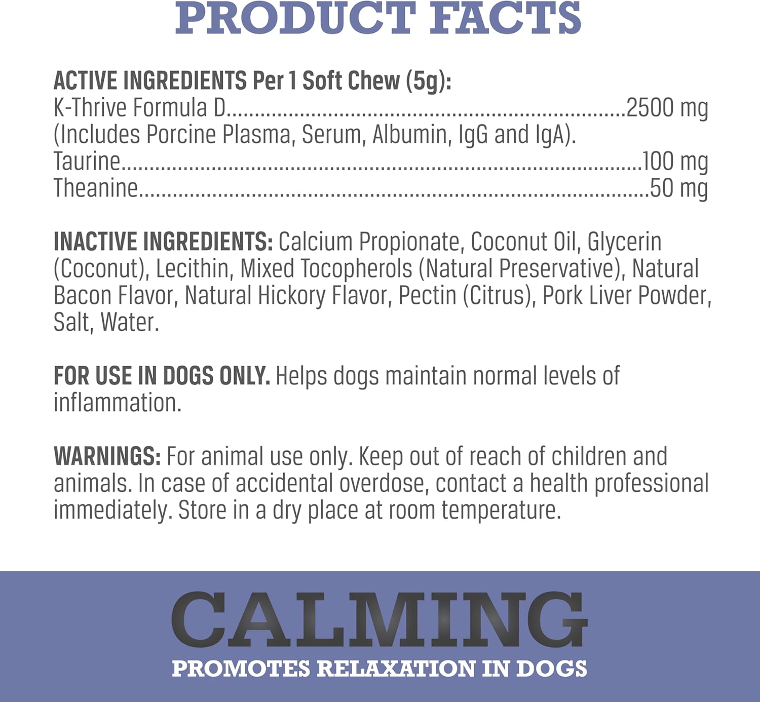 | Active Ingredients | ACTIVE INGREDIENTS Per 1 Chew (5g): K-Thrive™ Formula D (Includes Porcine Plasma, Serum, Albumin, IgG and IgA) (2500 mg), Taurine (100 mg), Theanine (50 mg). |