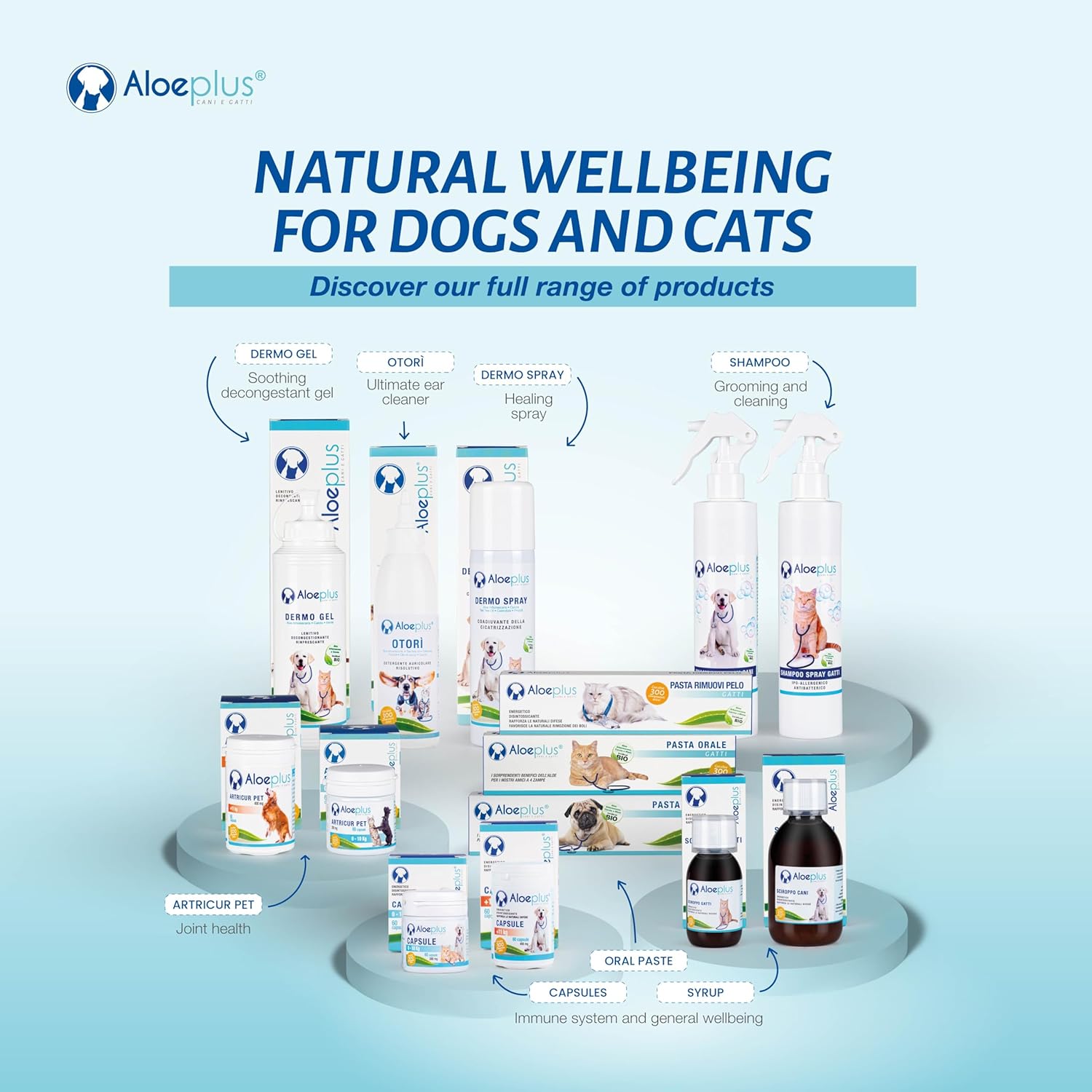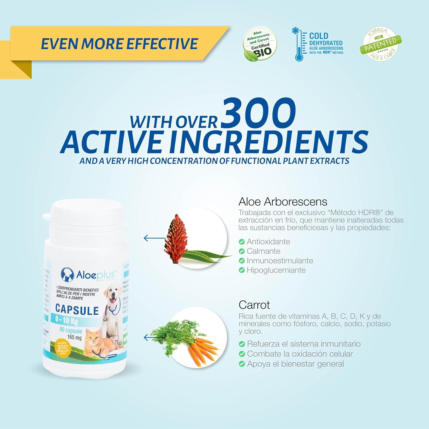Aloeplus Capsules for Dogs and Cats (0–10 kg) are a natural complementary feed made with organic Italian Aloe Arborescens and carrot. Designed to support the immune system, speed up recovery, and help restore appetite, they are ideal for puppies, senior pets, and animals under stress or during convalescence. Made in Italy, suitable for daily use, alone or alongside medical treatments.