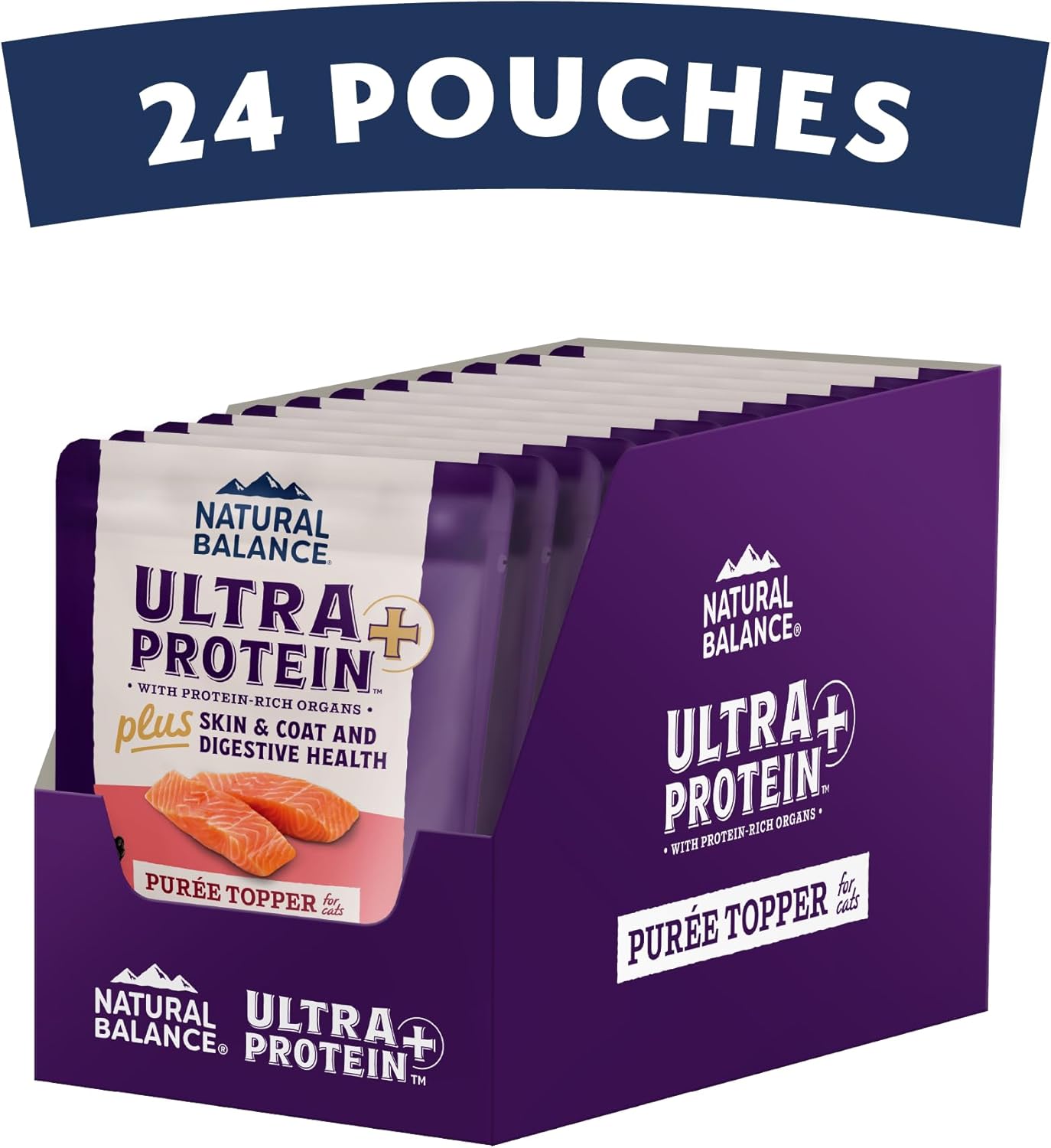 Natural Balance Ultra Protein Plus Skin & Coat and Digestive Health Real Salmon with Pumpkin Puree Topper is formulated specifically for cats with our veterinary and nutrition experts to maximize protein, taste and nutrition for even the pickiest eaters. Each delicious bite of this smooth puree topper salmon cat food is made with protein-rich organs for cats to give your cat the energy and taste they crave. Skin & Coat Health is supported by key nutrients Omega 3 & 6 Fatty Acids plus Vitamin E for premium Skin & Coat cat food. Digestive Health is supported by prebiotic fiber and easy-to-digest, fiber-rich ingredients like pumpkin to provide a digestive health cat food. This puree wet cat food is made with real salmon, chicken heart and with chicken liver to make one of the highest protein cat foods. Made without corn, wheat, soy, or by-product meals and no artificial colors, flavors or preservatives to provide your cat with a high-quality, high protein wet cat food that will leave them craving more.