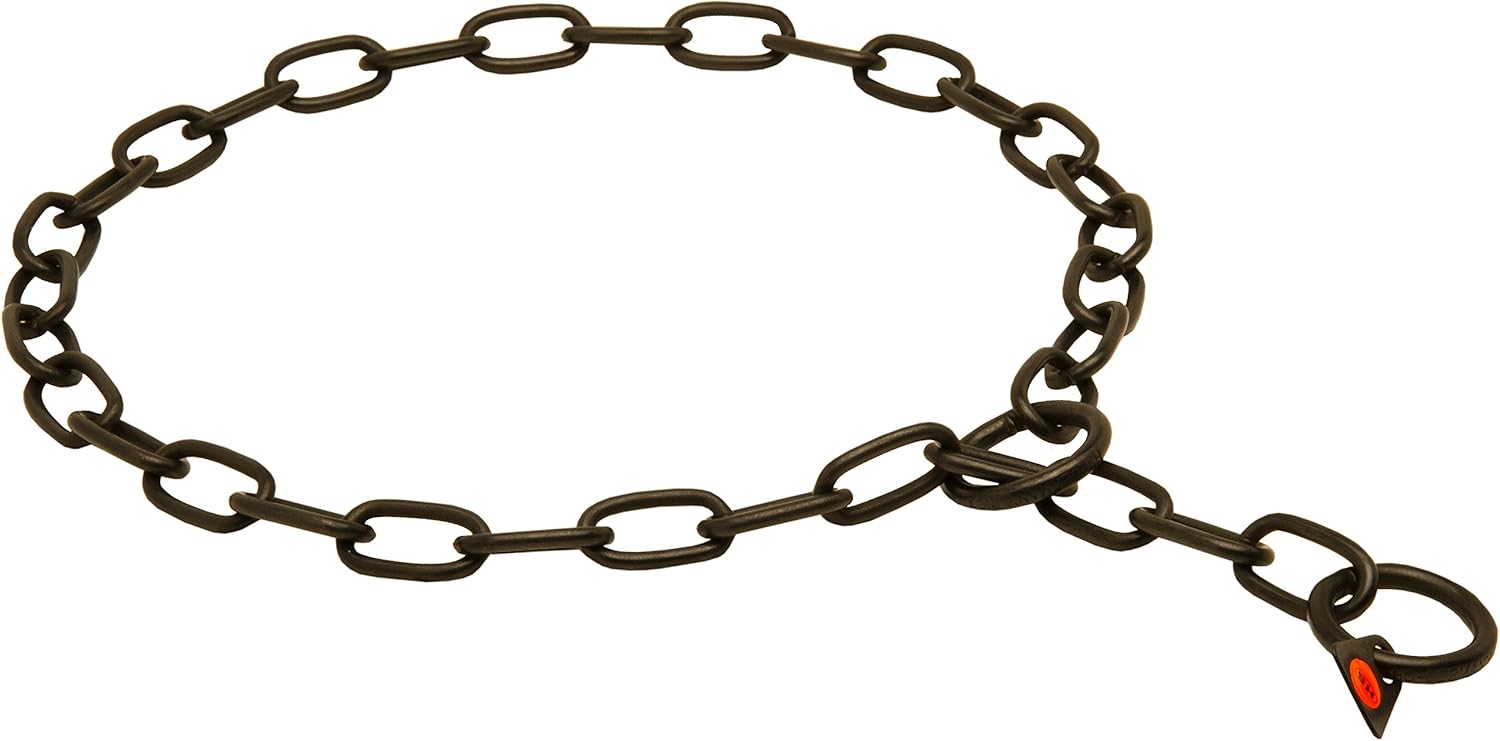 Has someone already told you that a choke collar is a very efficient training tool? And that it may look like a fashionable necklace? Now, you know this. Check this Herm Sprenger black choke collar to learn its benefits in details.This choke chain was created specially for training purposes. It has 2 O-rings and a chain with 3 mm link diameter. Therefore, you can use this gear for strong-willed dogs and be sure it will help.The chain itself is composed of medium sized links which don’t tangle pet’s hair. The links slide on the dog’s neck softly and keep the fur in good condition. This kind of chain fits canines with short hair.This item is 19 inches/50 cm long and will do for canines with 16-17 inches/40-43 cm neck circumference. How to measure your dog for the chain collar:Measure 1) the largest part of your dog's head, and 2) the middle of his/her neck.Determine the size of the collar you need using your dog’s head measurements if your dog's head is larger than his/her neck.Determine the size of the collar you need using your dog’s neck measurements if his/her neck is larger than the head.Now add 2" to to the above measurements (head or neck) for larger dogs and 1" to 1.5" for smaller dogs. This is the size collar you will need.This Herm Sprenger training collar is made of stainless steel and covered with a polymer layer which gives the item a black high-gloss surface and increased rust resistance. It won’t let the links abrade in the future.NOTE!This black stainless steel collar is suitable for dogs with dark fur and those canines who are not reactive to nickel. The collars made of black stainless steel may color fur. If your dog has light fur we advise to order a nickel free curogan collar or stainless steel chain collar with other features.