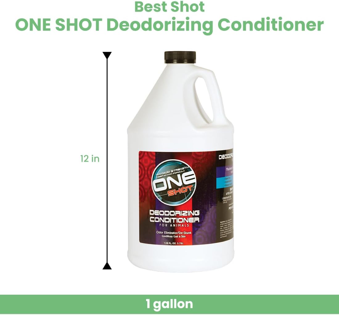 Provide a spa-like treatment to your pets from the comfort of your home with Best Shot ONE SHOT Deodorizing Conditioner, a great addition to your dog grooming supplies. Our hydrating, refreshing, and moisturizing conditioner effectively eliminates any stubborn odor and helps release shedding. With the presence of aloe vera, silk proteins, vitamins A, D, E, and ocean breeze botanical essence, the dog conditioner will moisturize your pet’s fur while leaving an aromatic fragrance behind. Our hydrating conditioner is suitable for livestock, horses, dogs, cats, puppies, foals, and kittens. Available in a pack of 1 gallon, this versatile conditioner can be diluted up to 5:1. For total odor annihilation, try all three products of ONE SHOT and witness the magic. The shampoo, conditioner, and spray will clean and soothe your pet’s skin and give them a shiny and fresh appearance.