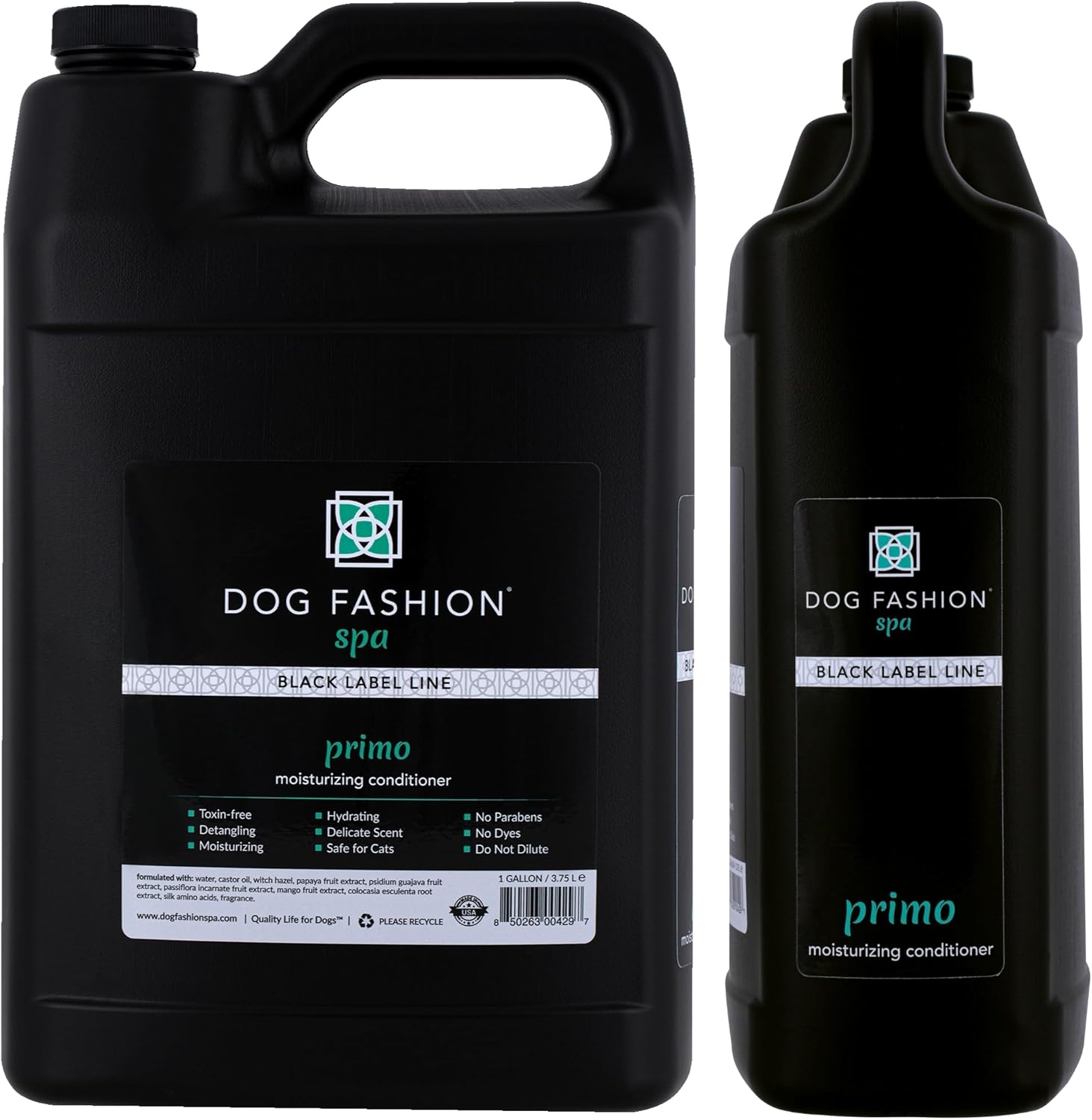 Dog Fashion Spa Primo Conditioner in a convenient 1-gallon size brings luxury grooming to professional salons and multi-pet households. This premium formula is designed to detangle and nourish, leaving coats silky, shiny, and easy to manage. Perfect for pet parents and groomers who want salon-quality results. Infused with fruit and flower extracts, this conditioner restores moisture and helps minimize dryness after bathing. The signature scent—a blend of jasmine, violet, lemon, and musk—adds elegance to every grooming session. Crafted without parabens, synthetic dyes, or GMOs, it offers purity and performance you can trust. Made in the USA, Dog Fashion Spa products are trusted by groomers and pet parents worldwide. Pair this conditioner with Dog Fashion Spa Primo Shampoo for the ultimate spa experience and enjoy long-lasting softness and shine.