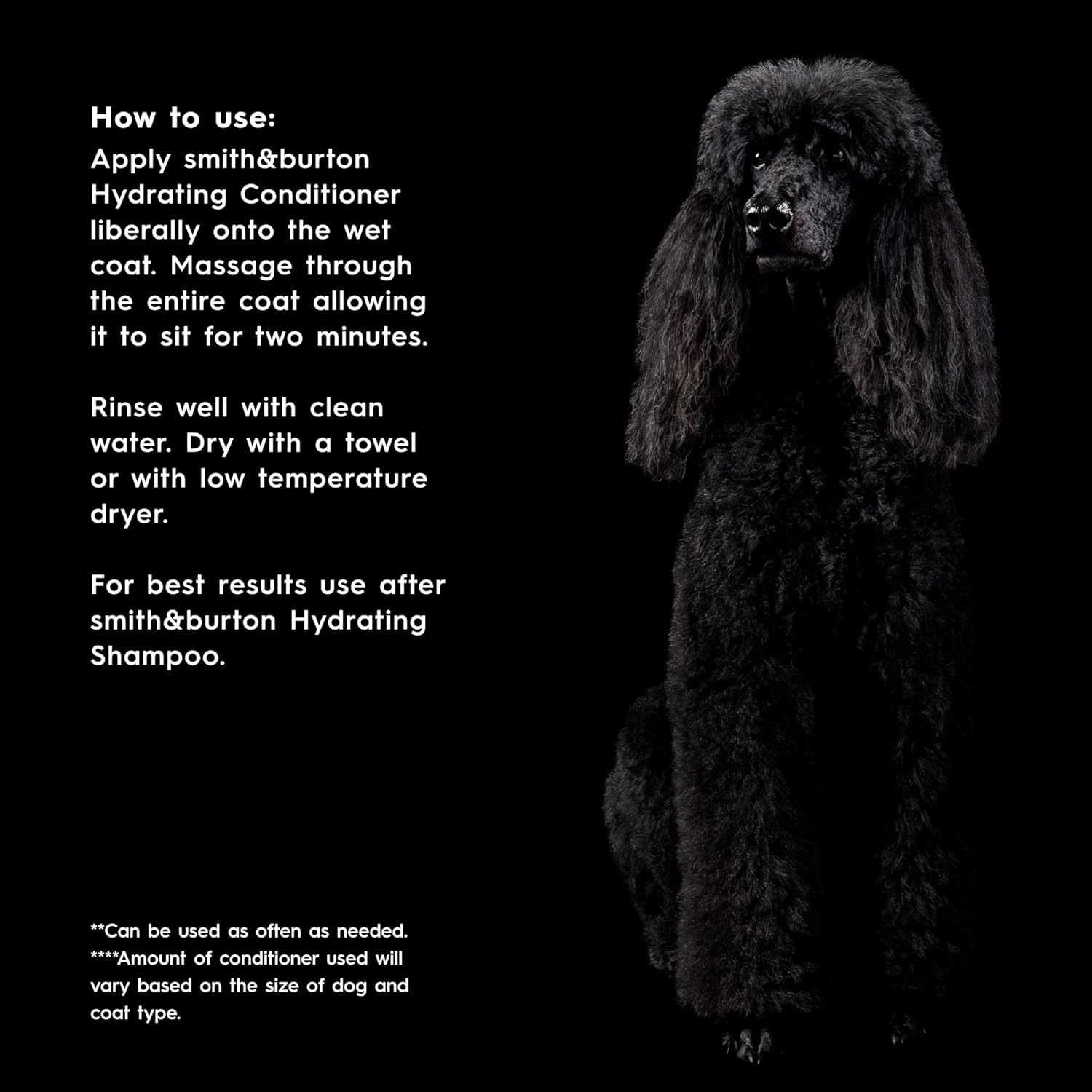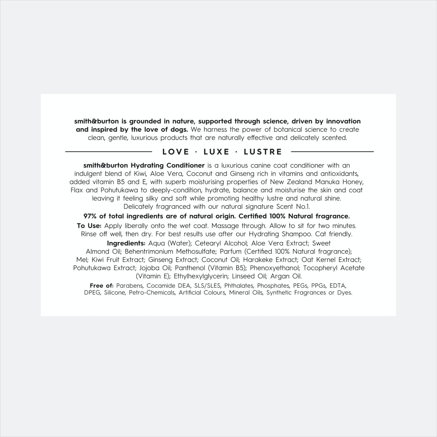 Give your dog or cat a refreshing boost of lightweight hydration with the smith&burton Hydrating Natural Conditioner. Inspired by New Zealand’s clean, botanical landscapes, this moisture-boosting formula is crafted to support healthier coats through gentle, daily-use conditioning.Aloe Vera, Coconut, Manuka Honey & more work together to help replenish moisture and maintain softness without heaviness. Ideal for wire, short haired and combination coats. The conditioner helps make brushing easier, supports comfort on dry skin, and gently assists with managing mild tangles. From energetic pups to senior companions, this hydrating blend is designed to deliver smooth manageability across a wide range of coat types.The experience is completed with smith&burton’s Signature Scent No.1, a refined marine-green fragrance created specifically for pets’ sensitive sense of smell. pH-balanced, naturally derived, cruelty-free and free from sulfates, silicones and harsh additives, this is conditioning care crafted with intention. Proudly made in New Zealand using high-quality ingredients for small dogs, large breeds and every beloved pet in between, it transforms grooming into a clean, gentle and soothing ritual.