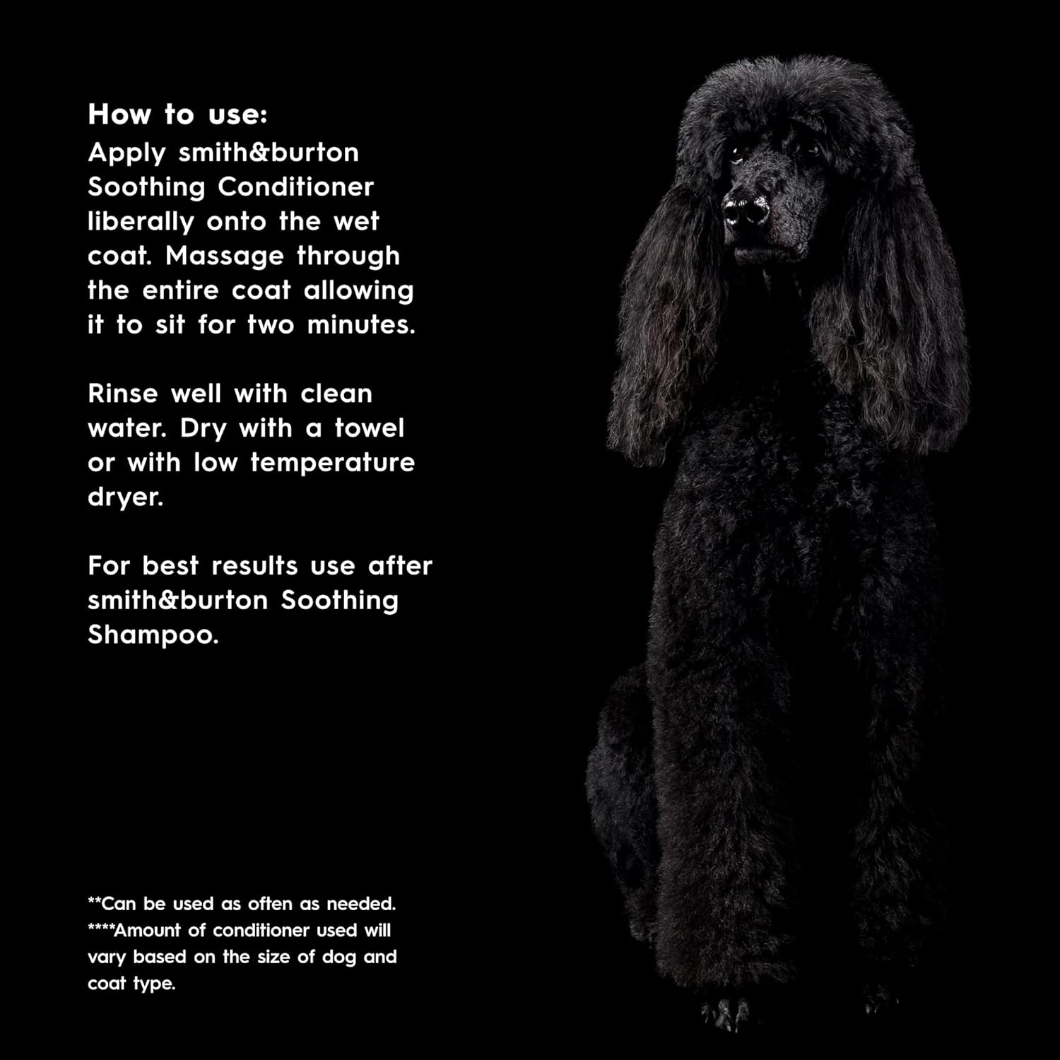 The smith&burton Soothing Conditioner is crafted to bring calm, gentle comfort to sensitive, itchy or dry skin after bathing. Designed as the perfect follow-on from your pet’s wash, it works as a calming dog conditioner to ease post-bath tension, soften coarse areas and support a smoother, more comfortable coat. Its light, silky feel helps reduce irritation that may remain after shampooing, making it ideal for delicate, reactive or senior pets who need softer after-wash care.A naturally effective blend of balm mint, chamomile, oat, rosemary and manuka honey, paired with New Zealand botanicals, helps soothe the skin while leaving the coat manageable and easier to brush. This gentle conditioner is especially suited for sensitive coats that require a balanced touch rather than strong, heavy formulas, offering a mild, comforting finish that doesn’t overwhelm the skin.Scent No.3 adds its own quiet refinement, combining floral-savory and green top notes with a smooth woody-sweet base to create a calming, smell-good aroma that is noticeable but not extreme. Consciously crafted for dogs’ refined sense of smell, it remains subtle and naturally balanced, making it suitable for dogs and cats alike.The pH-balanced, cruelty-free formula contains no nasties and is made with human-grade, naturally derived ingredients, reflecting smith&burton’s commitment to mindful, safe and natural grooming. Proudly crafted in New Zealand, this soothing conditioner offers a gentle, restorative finish that supports coat comfort, softness and a peaceful grooming experience.